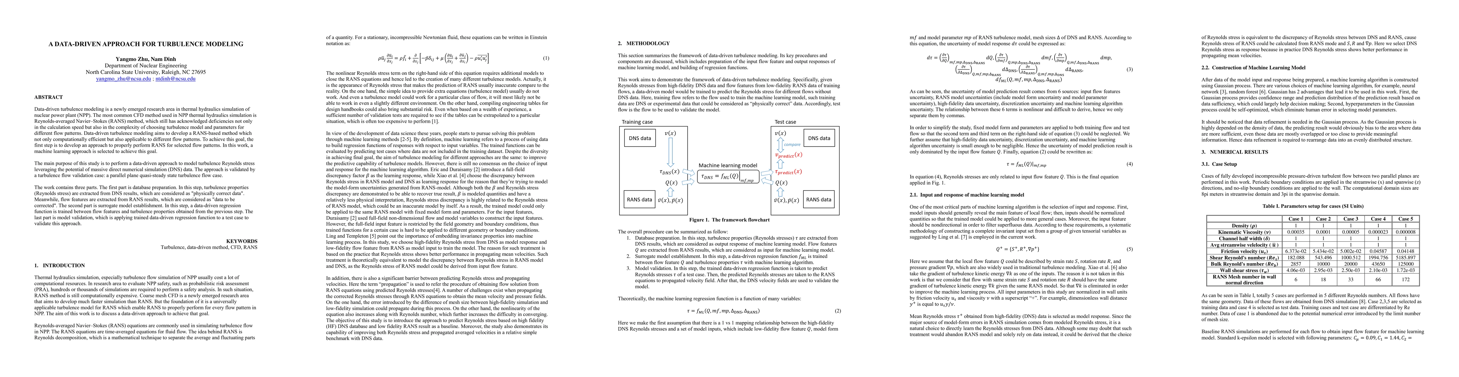 Data-driven turbulence modeling is a newly emerged research area in thermal hydraulics simulation of nuclear power plant (NPP). The most common CFD method used in NPP thermal hydraulics simulation is Reynolds-averaged Navier-Stokes (RANS) method, which still has acknowledged deficiencies not only in the calculation speed but also in the complexity of choosing turbulence model and parameters for different flow patterns. Data-driven turbulence modeling aims to develop a RANS-based method which not only computationally efficient but also applicable to different flow patterns. To achieve this goal, the first step is to develop an approach to properly perform RANS for selected flow patterns. In this work, a machine learning approach is selected to achieve this goal. The main purpose of this study is to perform a data-driven approach to model turbulence Reynolds stress leveraging the potential of massive direct numerical simulation (DNS) data. The approach is validated by a turbulence flow validation case: a parallel plane quasi-steady state turbulence flow case. The work contains three parts. The first part is database preparation. In this step, turbulence properties (Reynolds stress) are extracted from DNS results, which are considered as "physically correct data". Meanwhile, flow features are extracted from RANS results, which are considered as "data to be corrected". The second part is surrogate model establishment. In this step, a data-driven regression function is trained between flow features and turbulence properties obtained from the previous step. The last part is model validation, which is applying trained data-driven regression function to a test case to validate this approach.