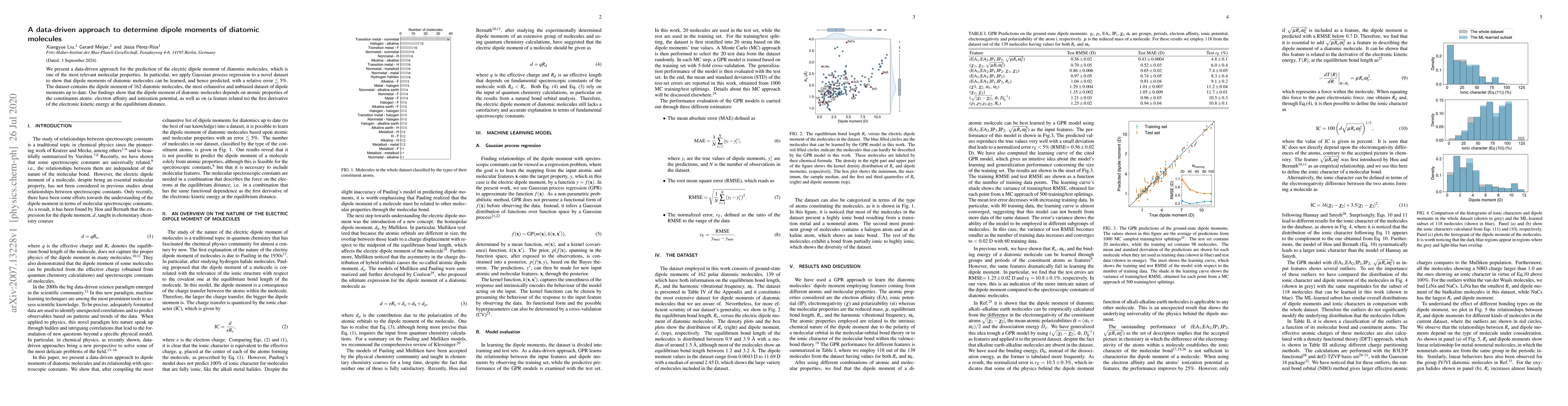 This research employs Gaussian process regression on a comprehensive dataset of 162 diatomic molecules to predict their electric dipole moments with a relative error of less than 5%. The findings indicate that dipole moments are influenced by atomic properties such as electron affinity, ionization potential, and the first derivative of the electronic kinetic energy.