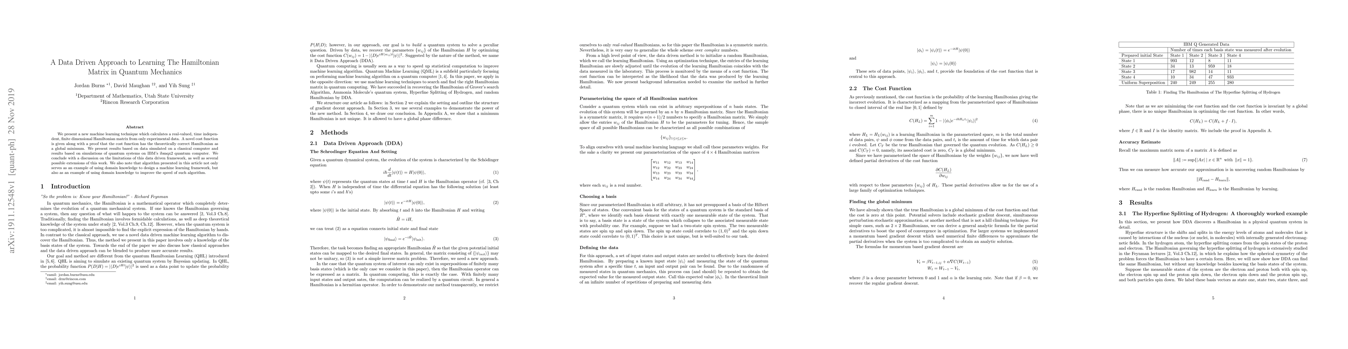 We present a new machine learning technique which calculates a real-valued, time independent, finite dimensional Hamiltonian matrix from only experimental data. A novel cost function is given along with a proof that the cost function has the theoretically correct Hamiltonian as a global minimum. We present results based on data simulated on a classical computer and results based on simulations of quantum systems on IBM's ibmqx2 quantum computer. We conclude with a discussion on the limitations of this data driven framework, as well as several possible extensions of this work. We also note that algorithm presented in this article not only serves as an example of using domain knowledge to design a machine learning framework, but also as an example of using domain knowledge to improve the speed of such algorithm.