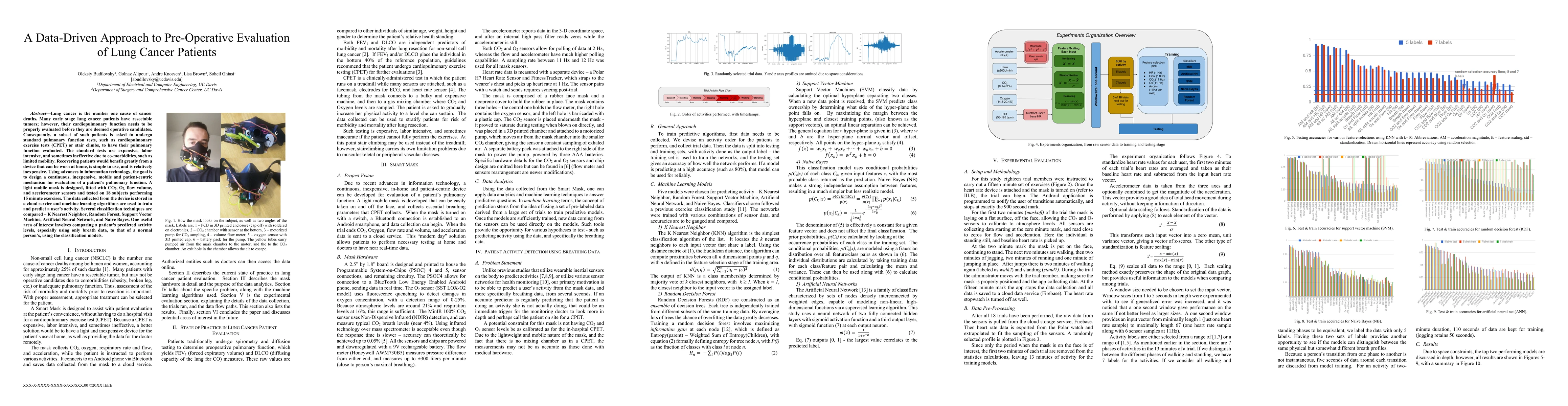 A wearable device with sensors was tested on 18 subjects to evaluate pulmonary function during exercise, using machine learning algorithms to predict activity levels based on breath data. The results show promise for a non-invasive, inexpensive tool for pre-operative evaluation of lung cancer patients.