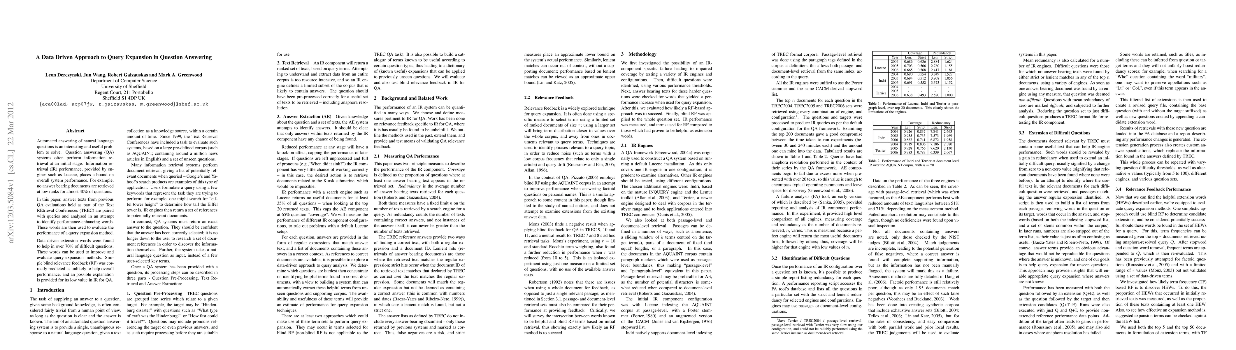 A data-driven approach to query expansion in question answering improved performance for 70% of difficult questions using performance-enhancing words. This method can help evaluate query expansion methods and provide insights into the limitations of blind relevance feedback.