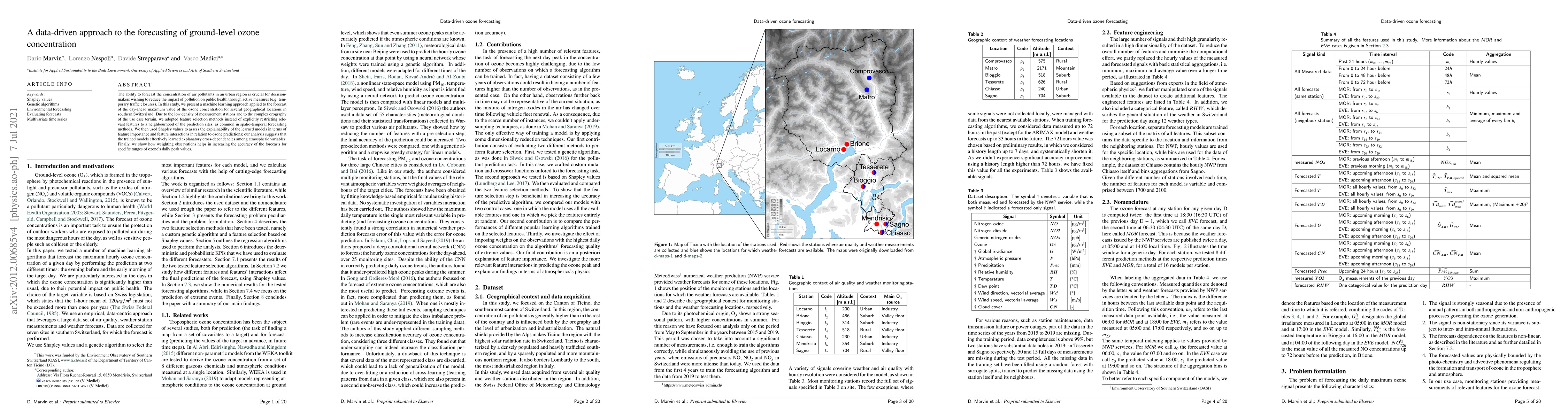 The ability to forecast the concentration of air pollutants in an urban region is crucial for decision-makers wishing to reduce the impact of pollution on public health through active measures (e.g. temporary traffic closures). In this study, we present a machine learning approach applied to the forecast of the day-ahead maximum value of the ozone concentration for several geographical locations in southern Switzerland. Due to the low density of measurement stations and to the complex orography of the use case terrain, we adopted feature selection methods instead of explicitly restricting relevant features to a neighbourhood of the prediction sites, as common in spatio-temporal forecasting methods. We then used Shapley values to assess the explainability of the learned models in terms of feature importance and feature interactions in relation to ozone predictions; our analysis suggests that the trained models effectively learned explanatory cross-dependencies among atmospheric variables. Finally, we show how weighting observations helps in increasing the accuracy of the forecasts for specific ranges of ozone's daily peak values.