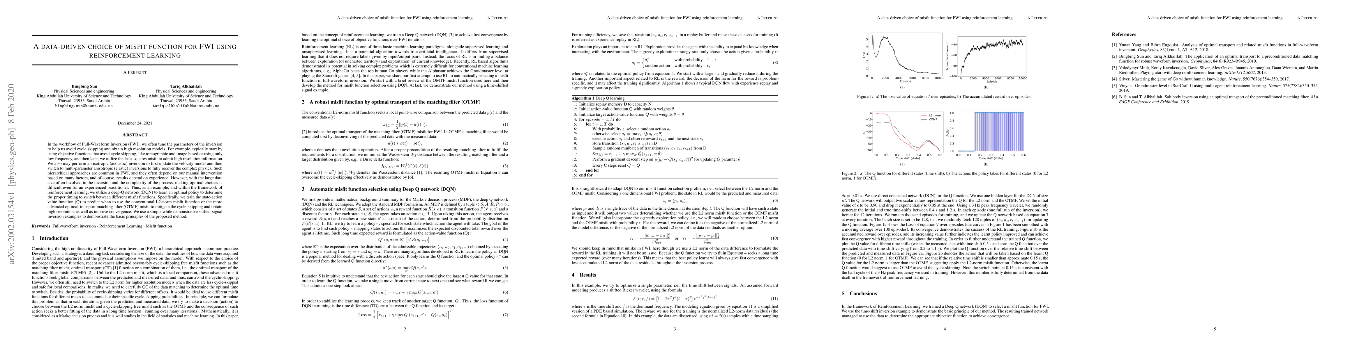 This paper proposes a reinforcement learning approach using a deep-Q network to optimize the choice of misfit functions in Full-Waveform Inversion (FWI), aiming to mitigate cycle-skipping and enhance resolution. The method trains a state-action value function to determine when to switch between L2-norm and optimal-transport matching-filter misfit functions.