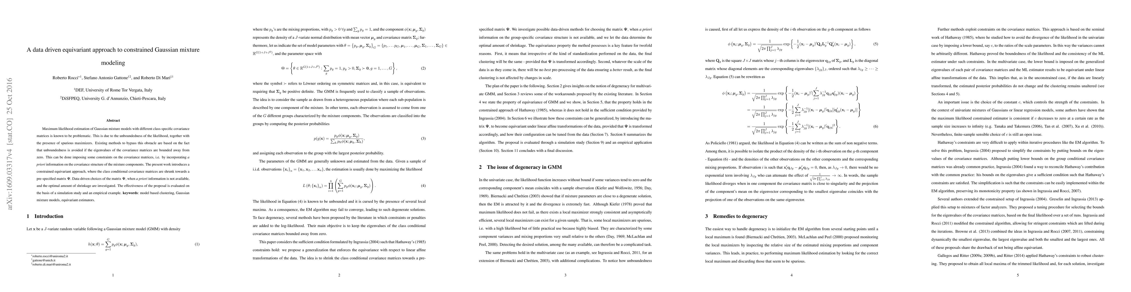 This paper proposes a constrained equivariant approach to Gaussian mixture modeling that shrinks class-specific covariance matrices towards a pre-specified matrix Psi to avoid unbounded likelihoods and spurious maximizers. The effectiveness of the method is demonstrated through simulations and empirical examples.