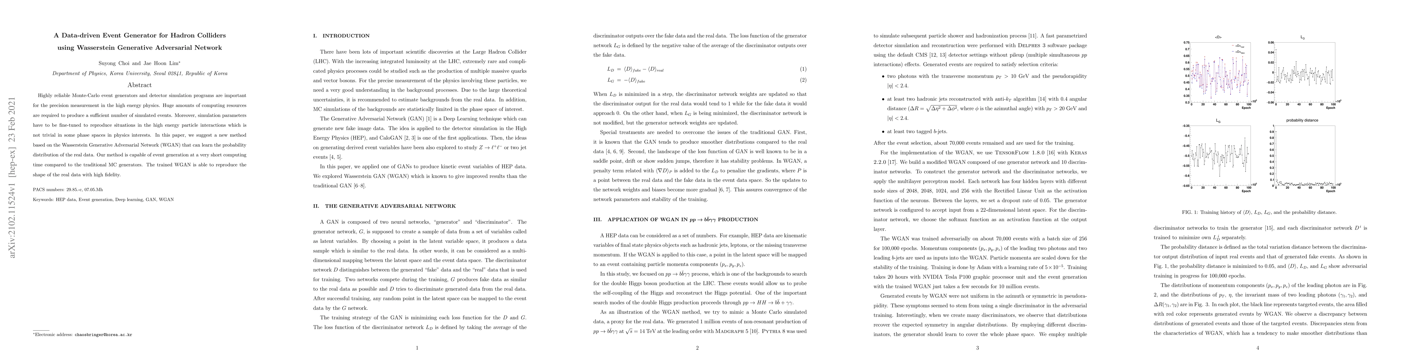 This paper proposes a novel method using Wasserstein Generative Adversarial Network (WGAN) for event generation in hadron colliders, offering faster computation and high fidelity data reproduction compared to traditional Monte-Carlo generators.