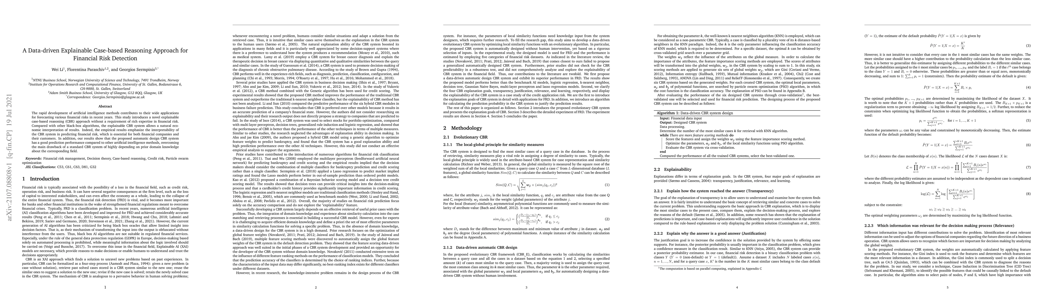 This paper proposes a data-driven, explainable case-based reasoning (CBR) approach for financial risk detection, emphasizing its interpretability and performance compared to black-box algorithms. The method demonstrates strong predictive capabilities and reduces reliance on extensive domain expertise.