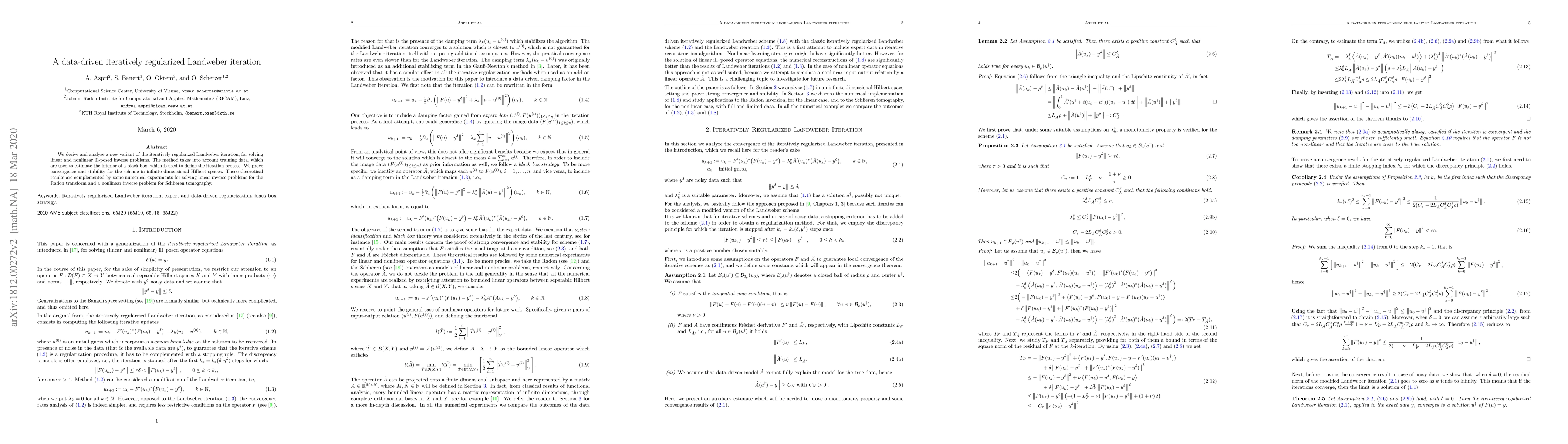 We derive and analyse a new variant of the iteratively regularized Landweber iteration, for solving linear and nonlinear ill-posed inverse problems. The method takes into account training data, which are used to estimate the interior of a black box, which is used to define the iteration process. We prove convergence and stability for the scheme in infinite dimensional Hilbert spaces. These theoretical results are complemented by several numerical experiments for solving linear inverse problems for the Radon transform and a nonlinear inverse problem for Schlieren tomography.