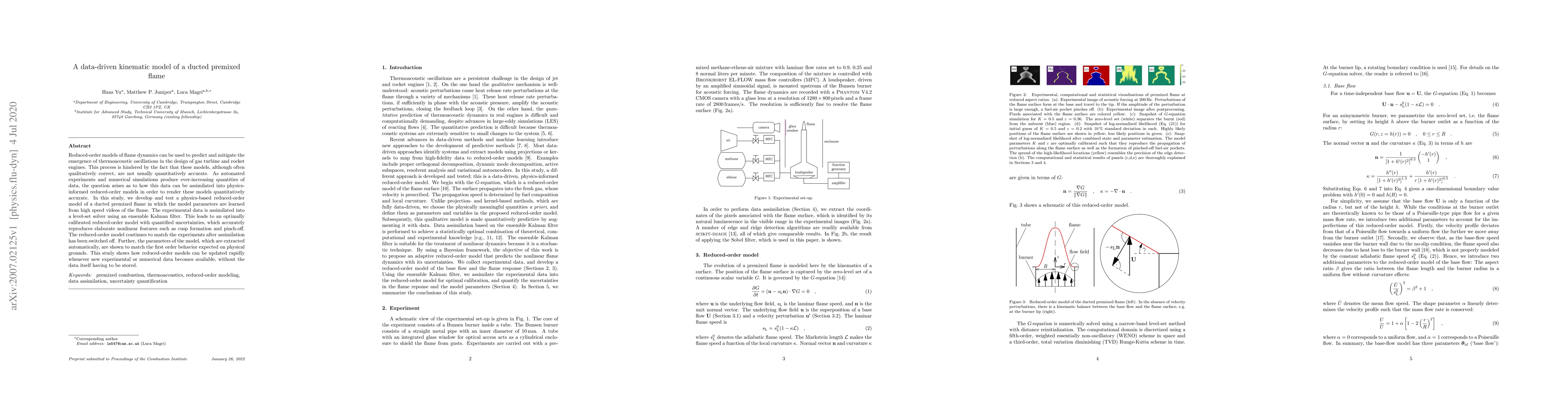 Reduced-order models of flame dynamics can be used to predict and mitigate the emergence of thermoacoustic oscillations in the design of gas turbine and rocket engines. This process is hindered by the fact that these models, although often qualitatively correct, are not usually quantitatively accurate. As automated experiments and numerical simulations produce ever-increasing quantities of data, the question arises as to how this data can be assimilated into physics-informed reduced-order models in order to render these models quantitatively accurate. In this study, we develop and test a physics-based reduced-order model of a ducted premixed flame in which the model parameters are learned from high speed videos of the flame. The experimental data is assimilated into a level-set solver using an ensemble Kalman filter. This leads to an optimally calibrated reduced-order model with quantified uncertainties, which accurately reproduces elaborate nonlinear features such as cusp formation and pinch-off. The reduced-order model continues to match the experiments after assimilation has been switched off. Further, the parameters of the model, which are extracted automatically, are shown to match the first order behavior expected on physical grounds. This study shows how reduced-order models can be updated rapidly whenever new experimental or numerical data becomes available, without the data itself having to be stored.