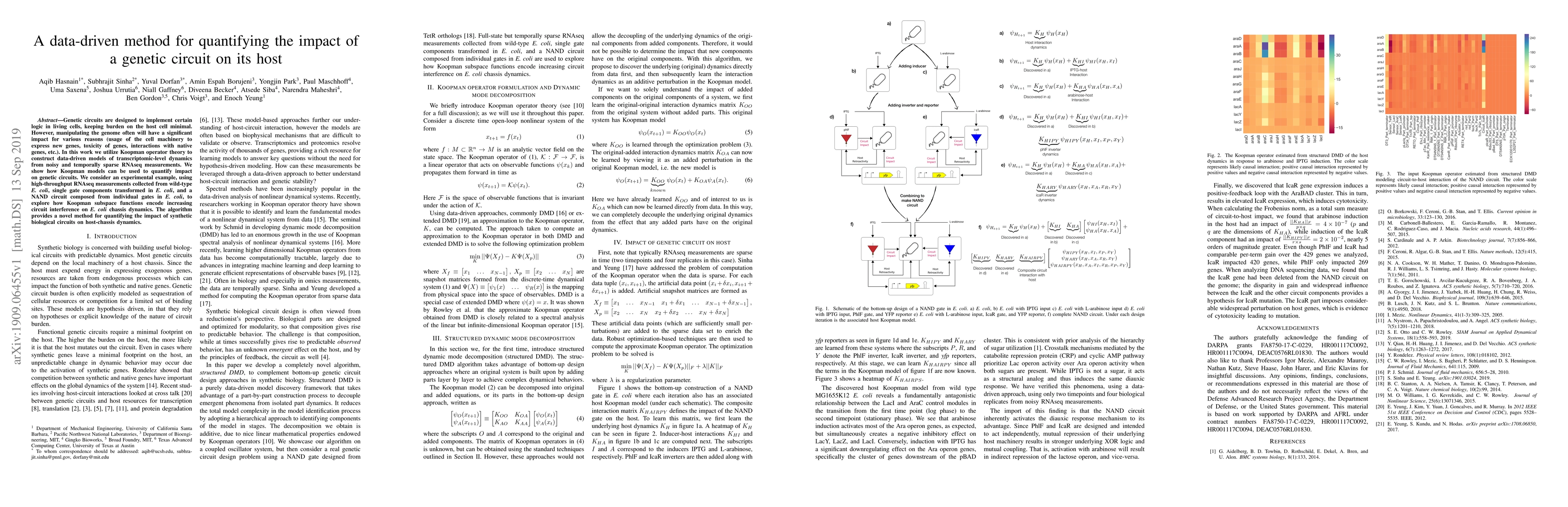 Genetic circuits are designed to implement certain logic in living cells, keeping burden on the host cell minimal. However, manipulating the genome often will have a significant impact for various reasons (usage of the cell machinery to express new genes, toxicity of genes, interactions with native genes, etc.). In this work we utilize Koopman operator theory to construct data-driven models of transcriptomic-level dynamics from noisy and temporally sparse RNAseq measurements. We show how Koopman models can be used to quantify impact on genetic circuits. We consider an experimental example, using high-throughput RNAseq measurements collected from wild-type E. coli, single gate components transformed in E. coli, and a NAND circuit composed from individual gates in E. coli, to explore how Koopman subspace functions encode increasing circuit interference on E. coli chassis dynamics. The algorithm provides a novel method for quantifying the impact of synthetic biological circuits on host-chassis dynamics.