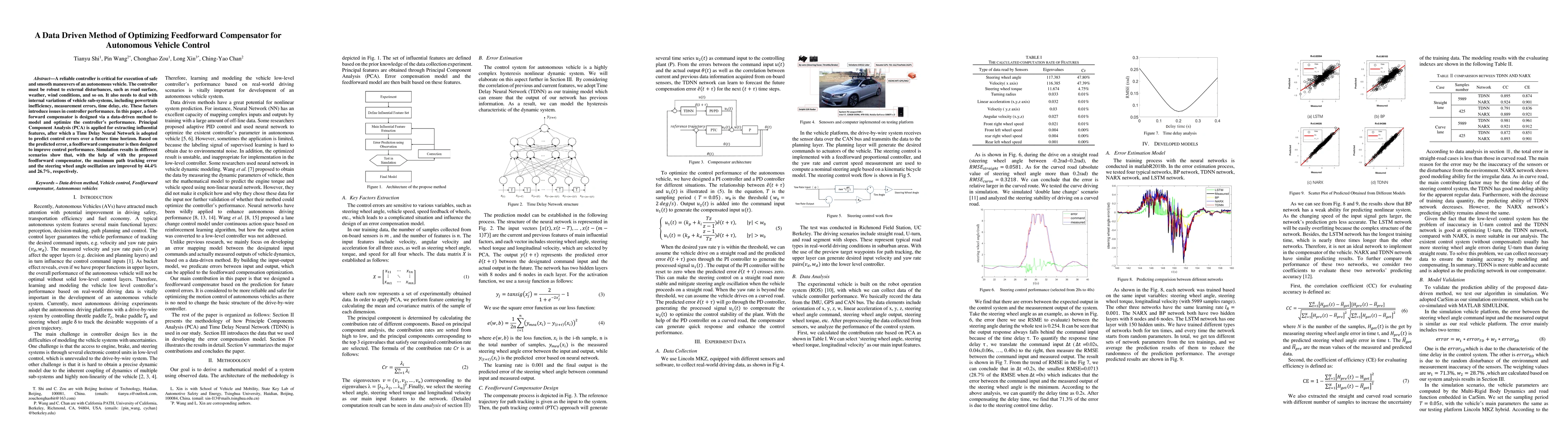 This paper proposes a data-driven method to optimize feedforward compensators for autonomous vehicles, using principal component analysis and time delay neural networks to improve controller performance in the face of external disturbances and internal parametric variations.