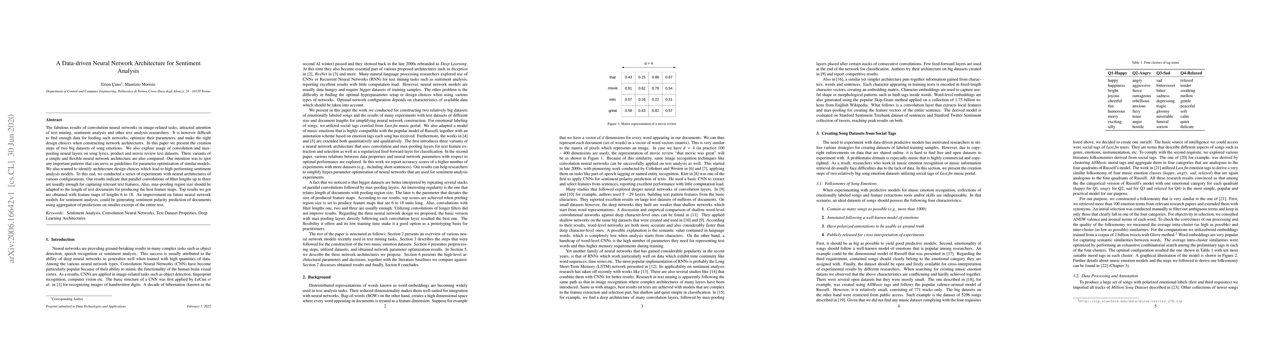 The fabulous results of convolution neural networks in image-related tasks, attracted attention of text mining, sentiment analysis and other text analysis researchers. It is however difficult to find enough data for feeding such networks, optimize their parameters, and make the right design choices when constructing network architectures. In this paper we present the creation steps of two big datasets of song emotions. We also explore usage of convolution and max-pooling neural layers on song lyrics, product and movie review text datasets. Three variants of a simple and flexible neural network architecture are also compared. Our intention was to spot any important patterns that can serve as guidelines for parameter optimization of similar models. We also wanted to identify architecture design choices which lead to high performing sentiment analysis models. To this end, we conducted a series of experiments with neural architectures of various configurations. Our results indicate that parallel convolutions of filter lengths up to three are usually enough for capturing relevant text features. Also, max-pooling region size should be adapted to the length of text documents for producing the best feature maps. Top results we got are obtained with feature maps of lengths 6 to 18. An improvement on future neural network models for sentiment analysis, could be generating sentiment polarity prediction of documents using aggregation of predictions on smaller excerpt of the entire text.