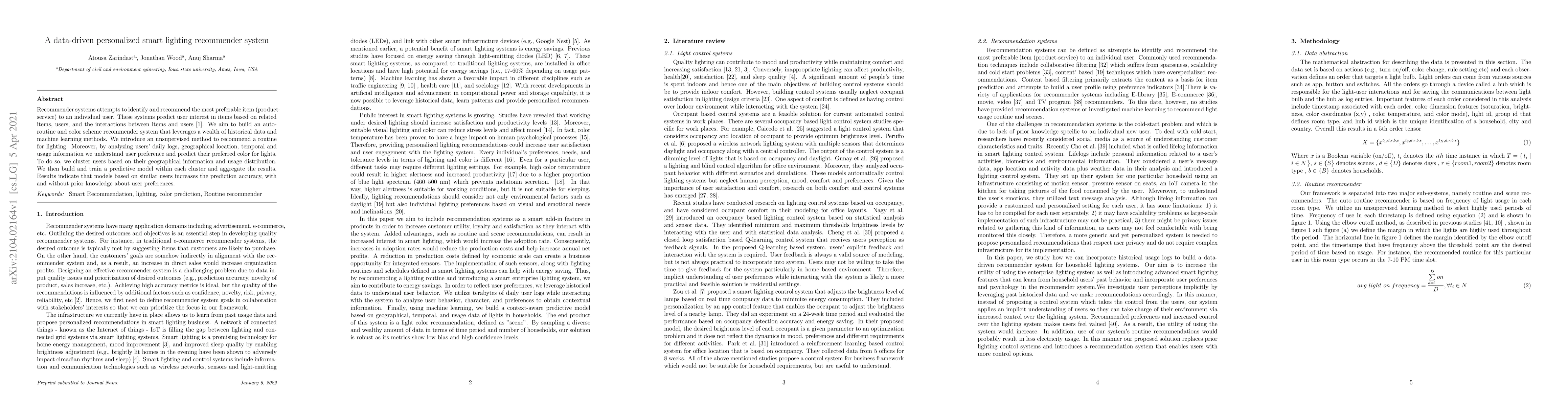 Recommender systems attempts to identify and recommend the most preferable item (product-service) to an individual user. These systems predict user interest in items based on related items, users, and the interactions between items and users. We aim to build an auto-routine and color scheme recommender system that leverages a wealth of historical data and machine learning methods. We introduce an unsupervised method to recommend a routine for lighting. Moreover, by analyzing users' daily logs, geographical location, temporal and usage information we understand user preference and predict their preferred color for lights. To do so, we cluster users based on their geographical information and usage distribution. We then build and train a predictive model within each cluster and aggregate the results. Results indicate that models based on similar users increases the prediction accuracy, with and without prior knowledge about user preferences.