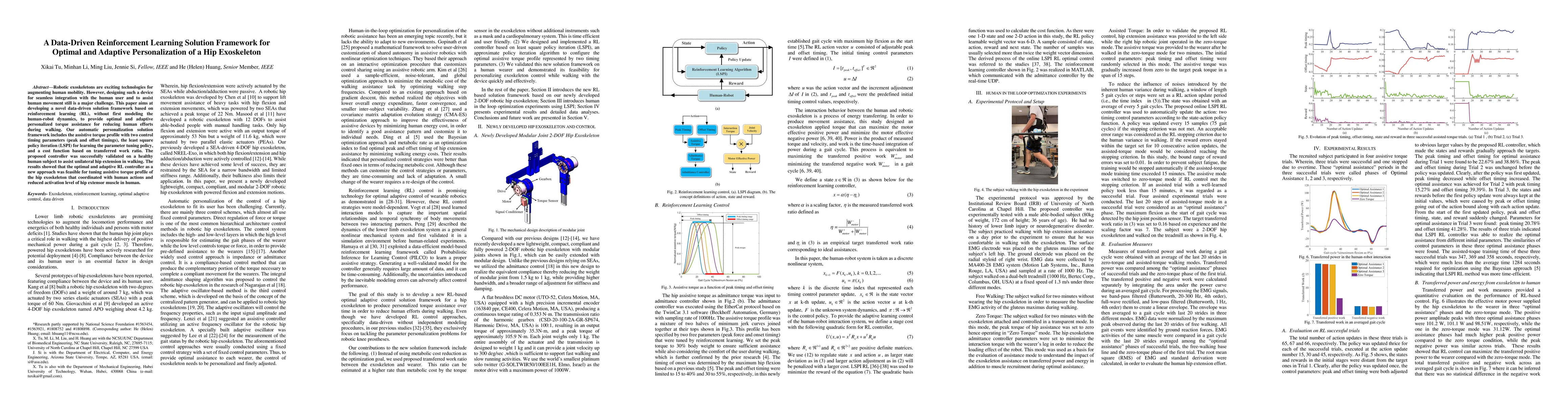 This paper proposes a data-driven reinforcement learning framework to optimally personalize a hip exoskeleton for human walking assistance. The framework uses least square policy iteration to learn an adaptive torque assistance policy without modeling human-robot dynamics, successfully reducing the activation level of the hip extensor muscle.