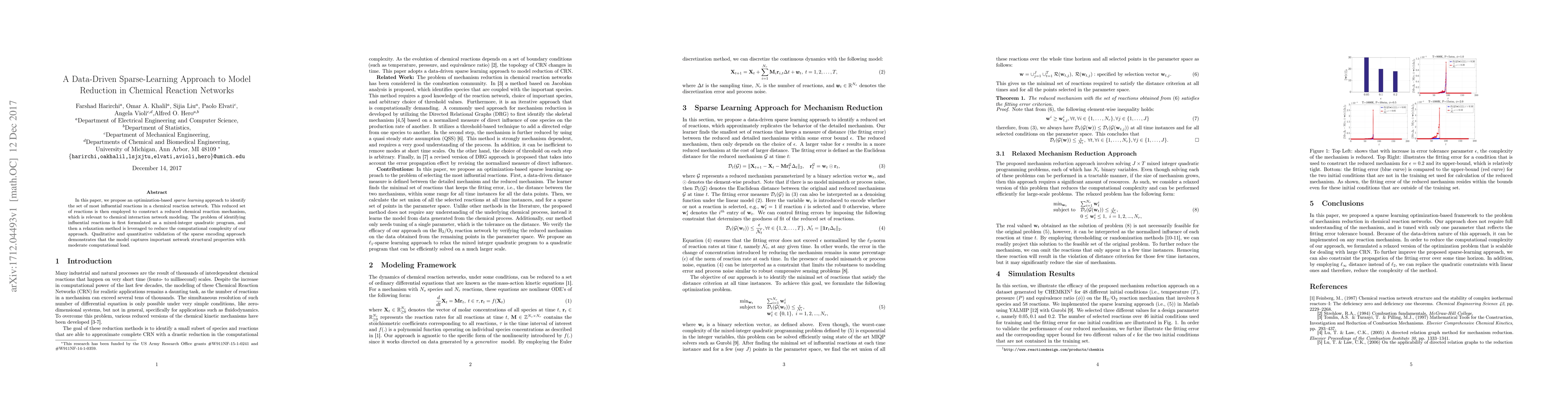 In this paper, we propose an optimization-based sparse learning approach to identify the set of most influential reactions in a chemical reaction network. This reduced set of reactions is then employed to construct a reduced chemical reaction mechanism, which is relevant to chemical interaction network modeling. The problem of identifying influential reactions is first formulated as a mixed-integer quadratic program, and then a relaxation method is leveraged to reduce the computational complexity of our approach. Qualitative and quantitative validation of the sparse encoding approach demonstrates that the model captures important network structural properties with moderate computational load.