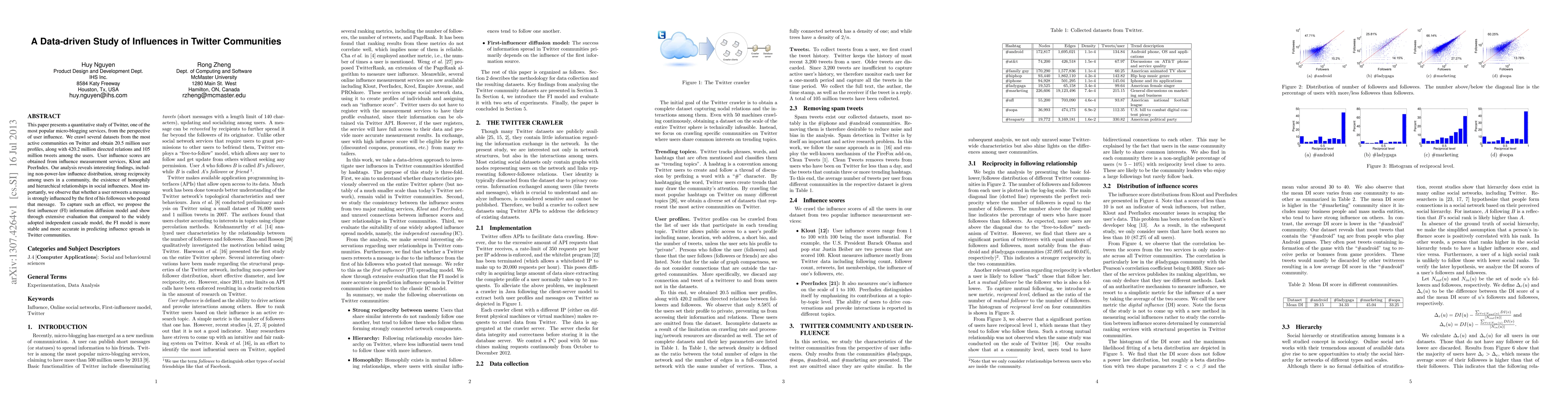 This paper presents a quantitative study of Twitter, one of the most popular micro-blogging services, from the perspective of user influence. We crawl several datasets from the most active communities on Twitter and obtain 20.5 million user profiles, along with 420.2 million directed relations and 105 million tweets among the users. User influence scores are obtained from influence measurement services, Klout and PeerIndex. Our analysis reveals interesting findings, including non-power-law influence distribution, strong reciprocity among users in a community, the existence of homophily and hierarchical relationships in social influences. Most importantly, we observe that whether a user retweets a message is strongly influenced by the first of his followees who posted that message. To capture such an effect, we propose the first influencer (FI) information diffusion model and show through extensive evaluation that compared to the widely adopted independent cascade model, the FI model is more stable and more accurate in predicting influence spreads in Twitter communities.