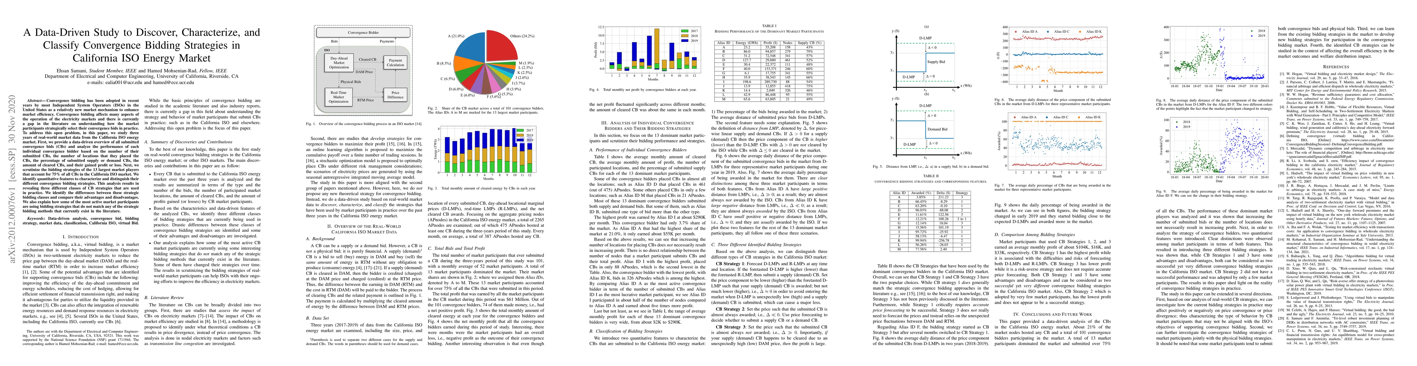 This paper analyzes three years of convergence bidding data from the California ISO energy market to characterize and classify the bidding strategies of major market participants. It identifies three distinct classes of convergence bidding strategies, highlighting their advantages and disadvantages, and reveals that some active participants employ unique strategies not covered in existing literature.