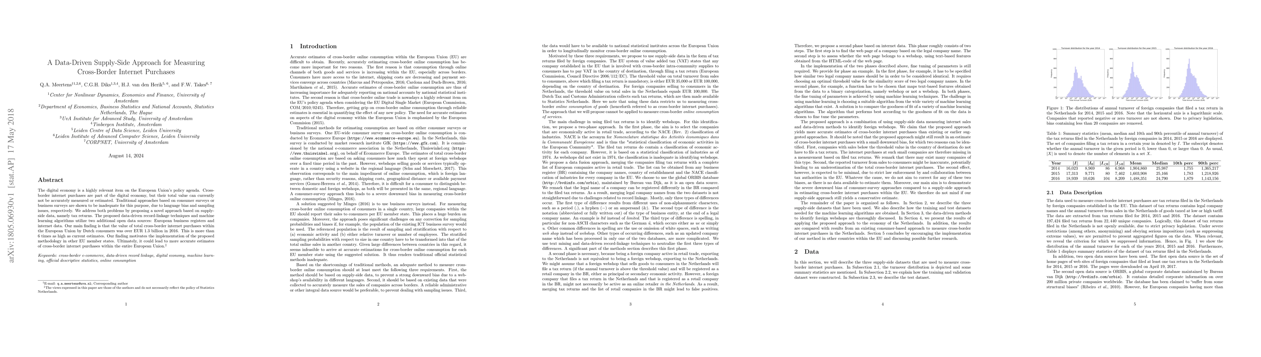 The digital economy is a highly relevant item on the European Union's policy agenda. Cross-border internet purchases are part of the digital economy, but their total value can currently not be accurately measured or estimated. Traditional approaches based on consumer surveys or business surveys are shown to be inadequate for this purpose, due to language bias and sampling issues, respectively. We address both problems by proposing a novel approach based on supply-side data, namely tax returns. The proposed data-driven record-linkage techniques and machine learning algorithms utilize two additional open data sources: European business registers and internet data. Our main finding is that the value of total cross-border internet purchases within the European Union by Dutch consumers was over EUR 1.3 billion in 2016. This is more than 6 times as high as current estimates. Our finding motivates the implementation of the proposed methodology in other EU member states. Ultimately, it could lead to more accurate estimates of cross-border internet purchases within the entire European Union.