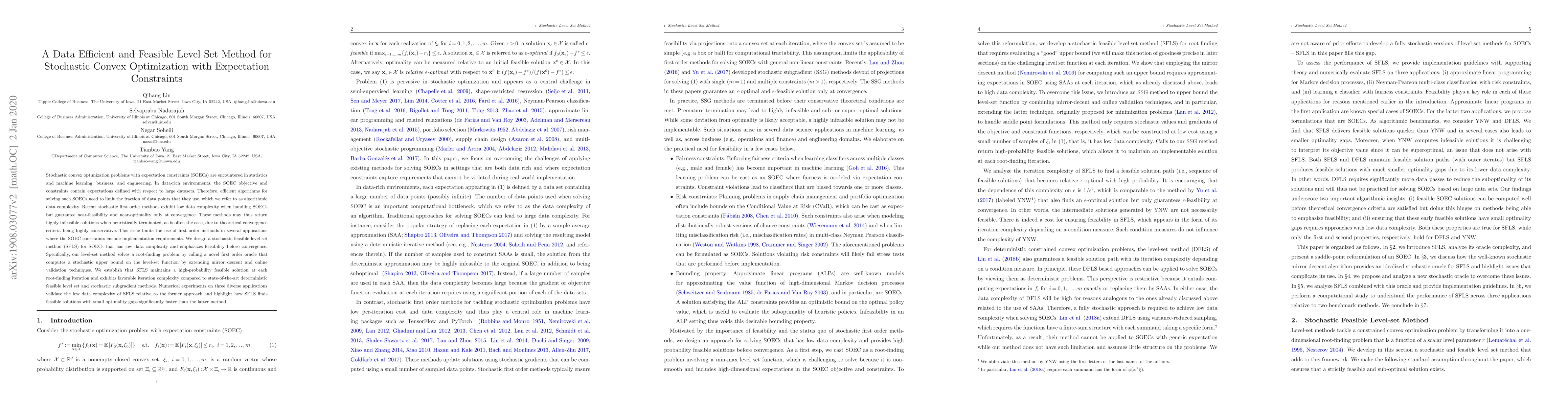 Stochastic convex optimization problems with expectation constraints (SOECs) are encountered in statistics and machine learning, business, and engineering. In data-rich environments, the SOEC objective and constraints contain expectations defined with respect to large datasets. Therefore, efficient algorithms for solving such SOECs need to limit the fraction of data points that they use, which we refer to as algorithmic data complexity. Recent stochastic first order methods exhibit low data complexity when handling SOECs but guarantee near-feasibility and near-optimality only at convergence. These methods may thus return highly infeasible solutions when heuristically terminated, as is often the case, due to theoretical convergence criteria being highly conservative. This issue limits the use of first order methods in several applications where the SOEC constraints encode implementation requirements. We design a stochastic feasible level set method (SFLS) for SOECs that has low data complexity and emphasizes feasibility before convergence. Specifically, our level-set method solves a root-finding problem by calling a novel first order oracle that computes a stochastic upper bound on the level-set function by extending mirror descent and online validation techniques. We establish that SFLS maintains a high-probability feasible solution at each root-finding iteration and exhibits favorable iteration complexity compared to state-of-the-art deterministic feasible level set and stochastic subgradient methods. Numerical experiments on three diverse applications validate the low data complexity of SFLS relative to the former approach and highlight how SFLS finds feasible solutions with small optimality gaps significantly faster than the latter method.