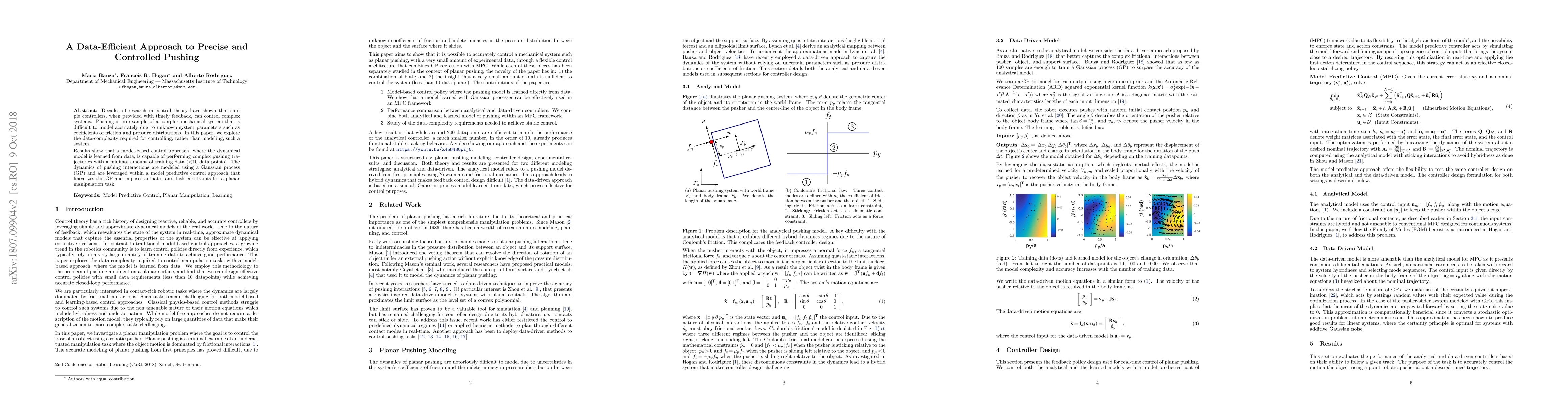 A new approach to controlling complex systems like pushing is presented, using just 10 data points, and achieves precise and controlled movements with minimal training data. This method leverages a Gaussian process model to learn the system dynamics and impose constraints for planar manipulation tasks.