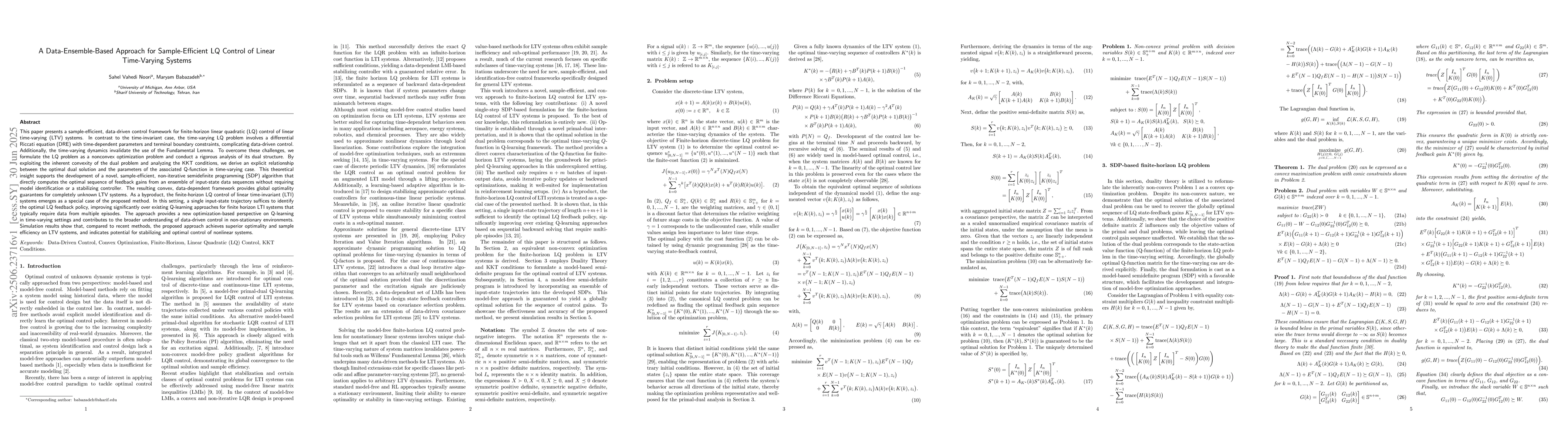 This paper presents a sample-efficient, data-driven control framework for finite-horizon linear quadratic (LQ) control of linear time-varying (LTV) systems. In contrast to the time-invariant case, the time-varying LQ problem involves a differential Riccati equation (DRE) with time-dependent parameters and terminal boundary constraints. We formulate the LQ problem as a nonconvex optimization problem and conduct a rigorous analysis of its dual structure. By exploiting the inherent convexity of the dual problem and analyzing the KKT conditions, we derive an explicit relationship between the optimal dual solution and the parameters of the associated Q-function in time-varying case. This theoretical insight supports the development of a novel, sample-efficient, non-iterative semidefinite programming (SDP) algorithm that directly computes the optimal sequence of feedback gains from an ensemble of input-state data sequences without model identification. The resulting convex, data-dependent framework provides global optimality guarantees for completely unknown LTV systems. As a special case, the method also applies to finite-horizon LQ control of linear time-invariant (LTI) systems. In this setting, a single input-state trajectory suffices to identify the optimal LQ feedback policy, improving significantly over existing Q-learning approaches for finite horizon LTI systems that typically require data from multiple episodes. The approach provides a new optimization-based perspective on Q-learning in time-varying settings and contributes to the broader understanding of data-driven control in non-stationary environments. Simulation results show that, compared to recent methods, the proposed approach achieves superior optimality and sample efficiency on LTV systems, and indicates potential for stabilizing and optimal control of nonlinear systems.