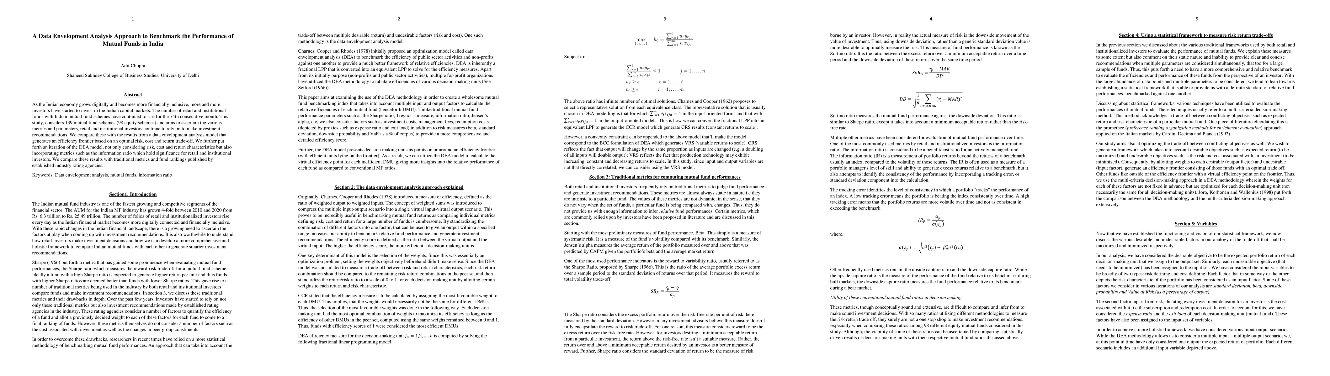 As the Indian economy grows digitally and becomes more financially inclusive, more and more investors have started to invest in the Indian capital markets. The number of retail and institutional folios with Indian mutual fund schemes have continued to rise for the 74th consecutive month. This study considers 139 mutual fund schemes (98 equity schemes) and aims to ascertain the various metrics and parameters, retail and institutional investors continue to rely on to make investment recommendations. We compare these with the results from a data envelopment analysis model that generates an efficiency frontier based on an optimal risk, cost, and return trade-off. We further put forth an iteration of the DEA model, not only considering risk, cost, and return characteristics but also incorporating metrics such as the information ratio which hold significance for retail and institutional investors. We compare these results with traditional metrics and fund rankings published by established industry rating agencies.