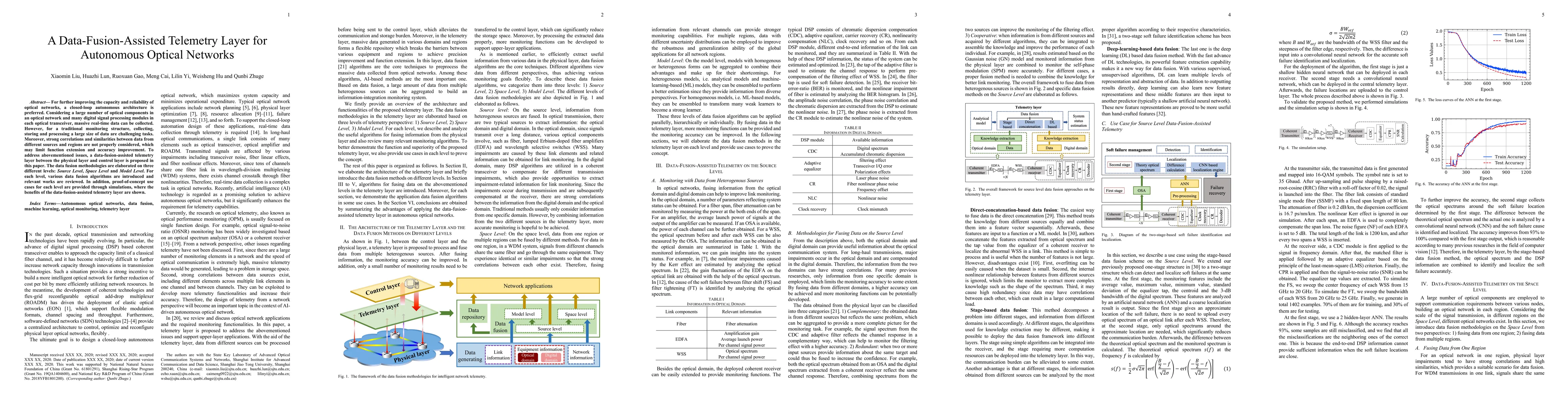For further improving the capacity and reliability of optical networks, a closed-loop autonomous architecture is preferred. Considering a large number of optical components in an optical network and many digital signal processing modules in each optical transceiver, massive real-time data can be collected. However, for a traditional monitoring structure, collecting, storing and processing a large size of data are challenging tasks. Moreover, strong correlations and similarities between data from different sources and regions are not properly considered, which may limit function extension and accuracy improvement. To address abovementioned issues, a data-fusion-assisted telemetry layer between the physical layer and control layer is proposed in this paper. The data fusion methodologies are elaborated on three different levels: Source Level, Space Level and Model Level. For each level, various data fusion algorithms are introduced and relevant works are reviewed. In addition, proof-of-concept use cases for each level are provided through simulations, where the benefits of the data-fusion-assisted telemetry layer are shown.