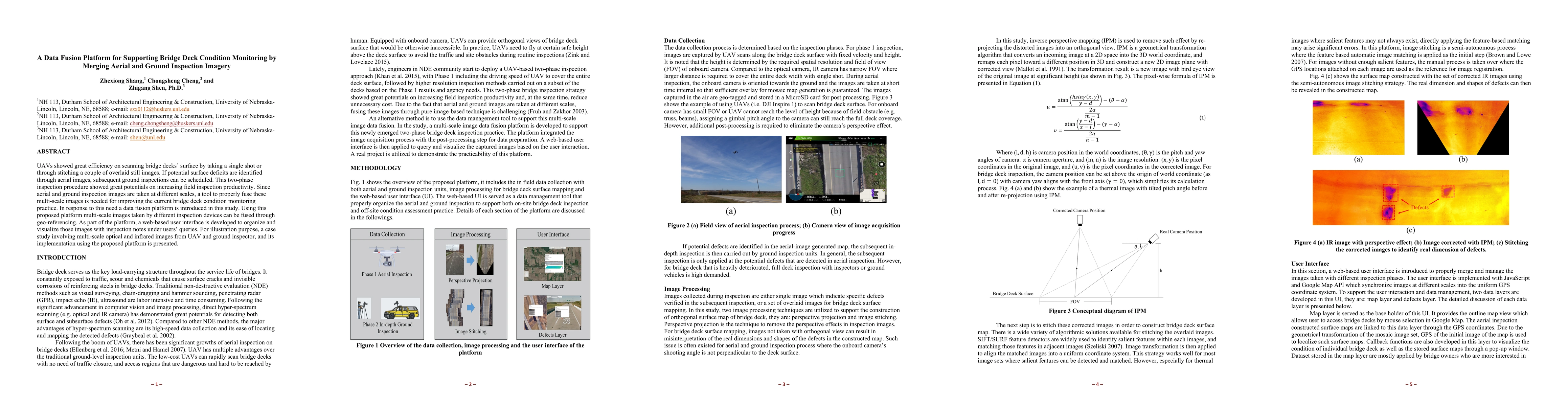 This paper presents a data fusion platform that merges aerial and ground inspection imagery to enhance bridge deck condition monitoring. The platform geo-references multi-scale images from UAVs and ground inspections, improving inspection productivity and facilitating targeted follow-up inspections.