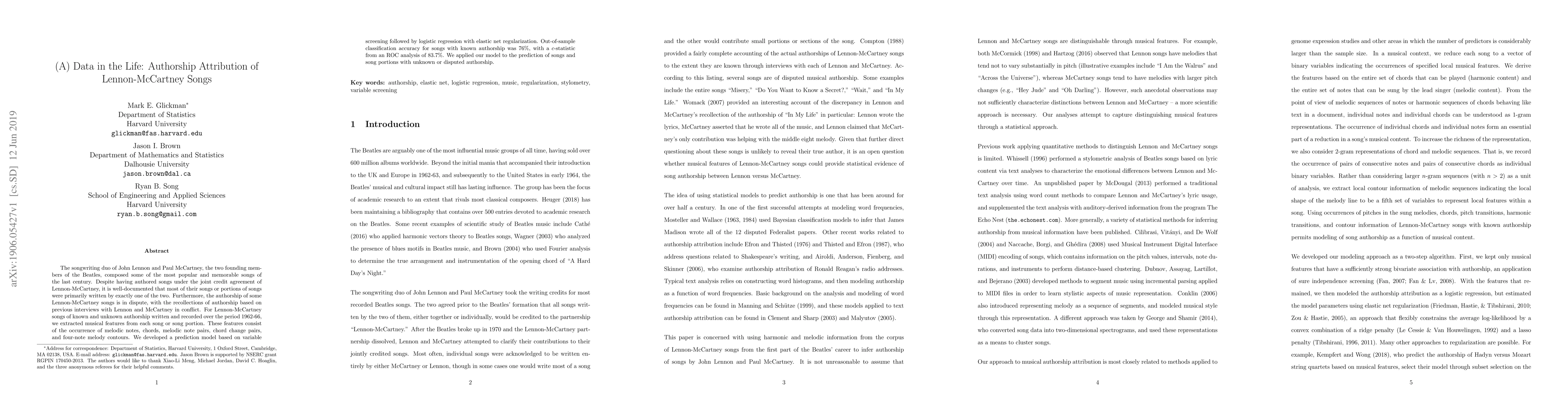 The songwriting duo of John Lennon and Paul McCartney, the two founding members of the Beatles, composed some of the most popular and memorable songs of the last century. Despite having authored songs under the joint credit agreement of Lennon-McCartney, it is well-documented that most of their songs or portions of songs were primarily written by exactly one of the two. Furthermore, the authorship of some Lennon-McCartney songs is in dispute, with the recollections of authorship based on previous interviews with Lennon and McCartney in conflict. For Lennon-McCartney songs of known and unknown authorship written and recorded over the period 1962-66, we extracted musical features from each song or song portion. These features consist of the occurrence of melodic notes, chords, melodic note pairs, chord change pairs, and four-note melody contours. We developed a prediction model based on variable screening followed by logistic regression with elastic net regularization. Out-of-sample classification accuracy for songs with known authorship was 76\%, with a $c$-statistic from an ROC analysis of 83.7\%. We applied our model to the prediction of songs and song portions with unknown or disputed authorship.