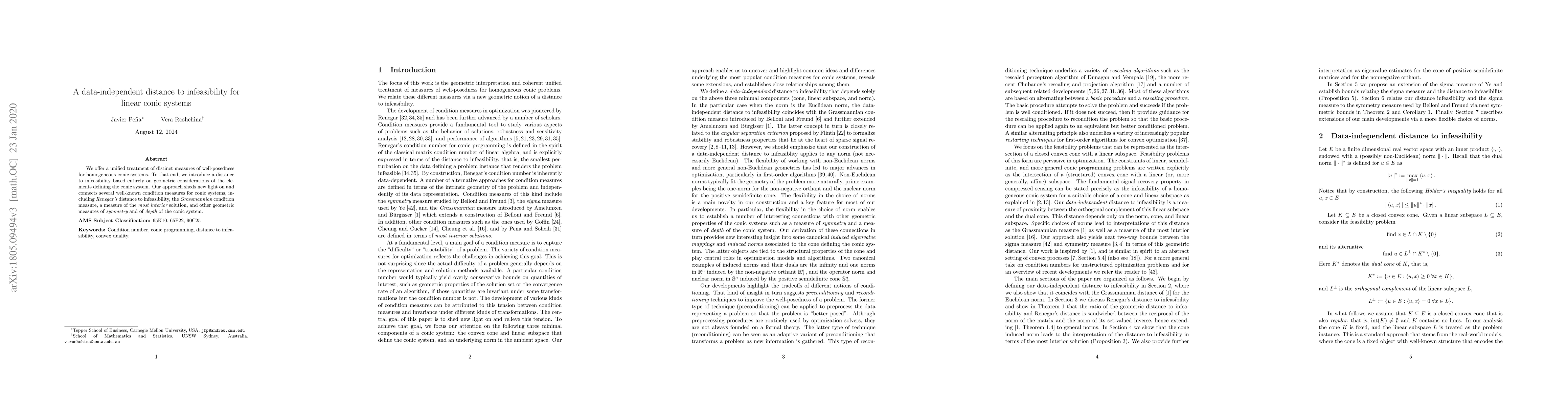 This paper introduces a new data-independent distance to infeasibility for linear conic systems, based purely on geometric considerations. It connects and unifies various existing measures of well-posedness, including Renegar's distance, the Grassmannian condition measure, and other geometric measures of symmetry and depth.