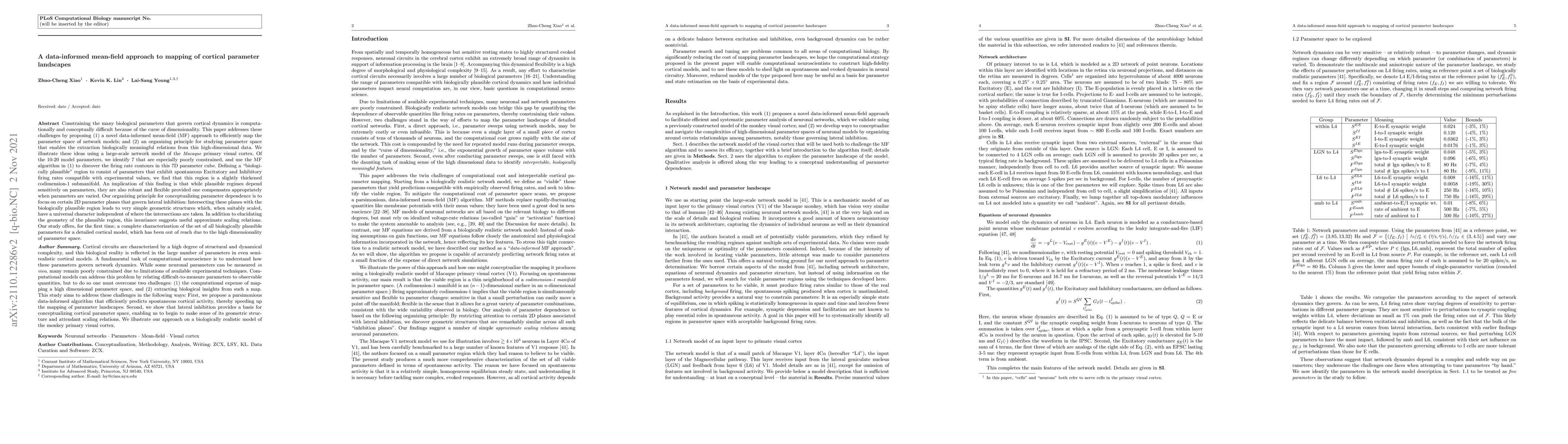 Constraining the many biological parameters that govern cortical dynamics is computationally and conceptually difficult because of the curse of dimensionality. This paper addresses these challenges by proposing (1) a novel data-informed mean-field (MF) approach to efficiently map the parameter space of network models; and (2) an organizing principle for studying parameter space that enables the extraction biologically meaningful relations from this high-dimensional data. We illustrate these ideas using a large-scale network model of the Macaque primary visual cortex. Of the 10-20 model parameters, we identify 7 that are especially poorly constrained, and use the MF algorithm in (1) to discover the firing rate contours in this 7D parameter cube. Defining a "biologically plausible" region to consist of parameters that exhibit spontaneous Excitatory and Inhibitory firing rates compatible with experimental values, we find that this region is a slightly thickened codimension-1 submanifold. An implication of this finding is that while plausible regimes depend sensitively on parameters, they are also robust and flexible provided one compensates appropriately when parameters are varied. Our organizing principle for conceptualizing parameter dependence is to focus on certain 2D parameter planes that govern lateral inhibition: Intersecting these planes with the biologically plausible region leads to very simple geometric structures which, when suitably scaled, have a universal character independent of where the intersections are taken. In addition to elucidating the geometry of the plausible region, this invariance suggests useful approximate scaling relations. Our study offers, for the first time, a complete characterization of the set of all biologically plausible parameters for a detailed cortical model, which has been out of reach due to the high dimensionality of parameter space.