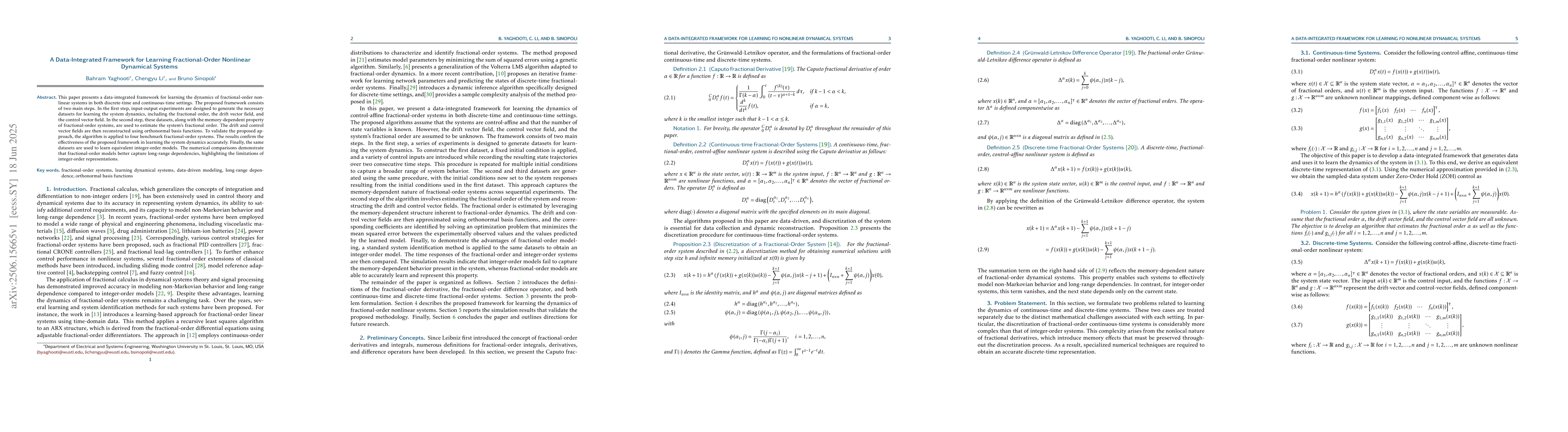 This paper presents a data-integrated framework for learning the dynamics of fractional-order nonlinear systems in both discrete-time and continuous-time settings. The proposed framework consists of two main steps. In the first step, input-output experiments are designed to generate the necessary datasets for learning the system dynamics, including the fractional order, the drift vector field, and the control vector field. In the second step, these datasets, along with the memory-dependent property of fractional-order systems, are used to estimate the system's fractional order. The drift and control vector fields are then reconstructed using orthonormal basis functions. To validate the proposed approach, the algorithm is applied to four benchmark fractional-order systems. The results confirm the effectiveness of the proposed framework in learning the system dynamics accurately. Finally, the same datasets are used to learn equivalent integer-order models. The numerical comparisons demonstrate that fractional-order models better capture long-range dependencies, highlighting the limitations of integer-order representations.