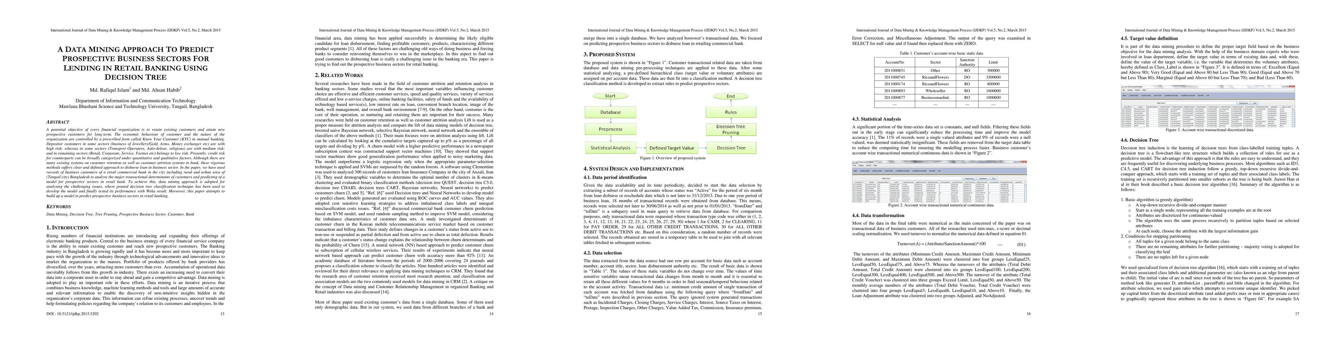 This paper uses data mining and a pruned decision tree classification technique to analyze transactional data from retail banking customers in Tangail city, Bangladesh, aiming to predict prospective business sectors for lending. The model evaluates economic behavior and risk levels across different sectors, providing a clearer approach for loan disbursement in retail banking.