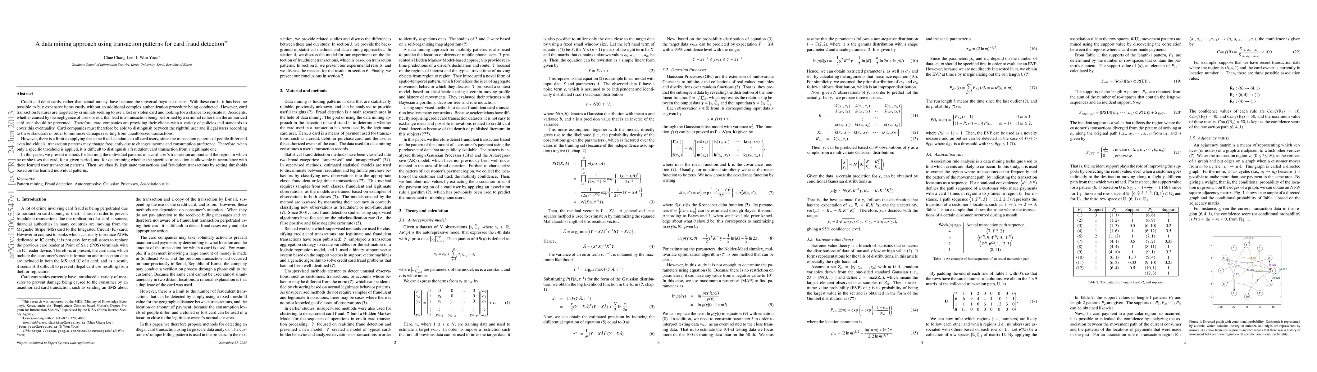 This paper proposes a data mining approach to detect card fraud by learning individual transaction patterns, including amounts and regions, to distinguish between legitimate and fraudulent transactions. It sets dynamic thresholds based on these learned patterns to improve fraud detection accuracy.