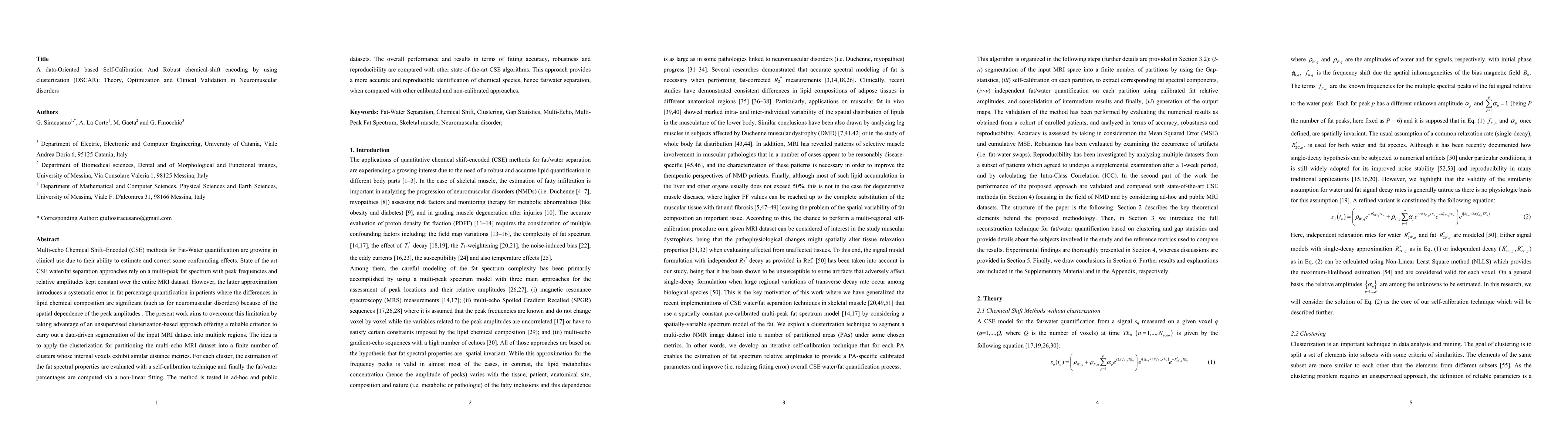 Multi-echo Chemical Shift Encoded methods for Fat-Water quantification are growing in clinical use due to their ability to estimate and correct some confounding effects. State of the art CSE water-fat separation approaches rely on a multi-peak fat spectrum with peak frequencies and relative amplitudes kept constant over the entire MRI dataset. However, the latter approximation introduces a systematic error in fat percentage quantification in patients where the differences in lipid chemical composition are significant, such as for neuromuscular disorders, because of the spatial dependence of the peak amplitudes. The present work aims to overcome this limitation by taking advantage of an unsupervised clusterization-based approach offering a reliable criterion to carry out a data-driven segmentation of the input MRI dataset into multiple regions. The idea is to apply the clusterization for partitioning the multi-echo MRI dataset into a finite number of clusters whose internal voxels exhibit similar distance metrics. For each cluster, the estimation of the fat spectral properties are evaluated with a self-calibration technique and finally the fat-water percentages are computed via a non-linear fitting. The method is tested in ad-hoc and public datasets. The overall performance and results in terms of fitting accuracy, robustness and reproducibility are compared with other state-of-the-art CSE algorithms. This approach provides a more accurate and reproducible identification of chemical species, hence fat-water separation, when compared with other calibrated and non-calibrated approaches.
