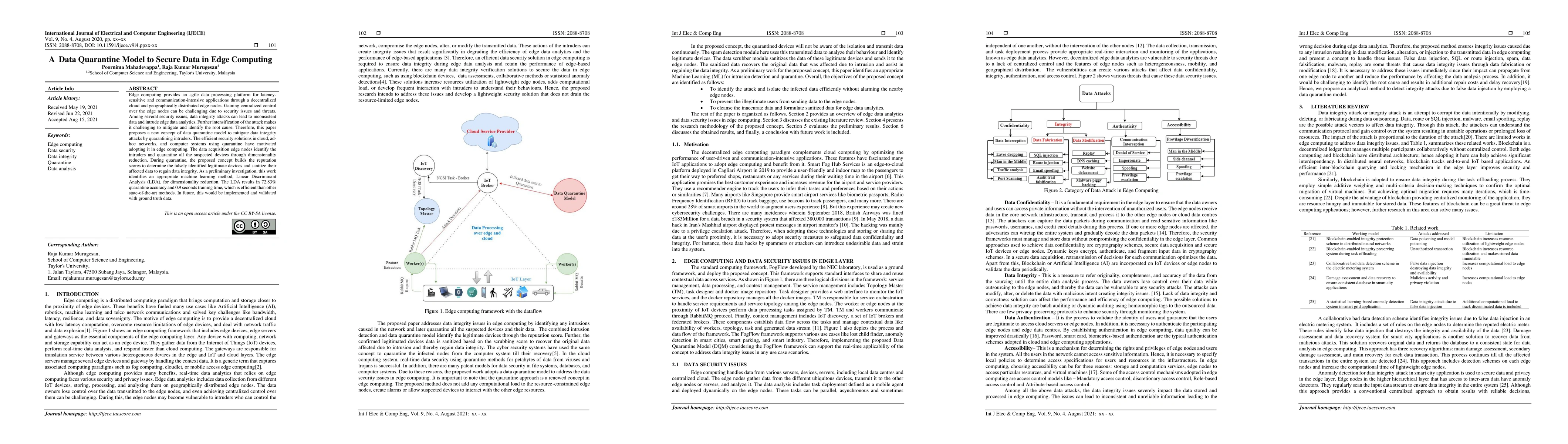 A new data quarantine model is proposed to secure edge computing by identifying and quarantining intruders, with a 72.83% accuracy rate.