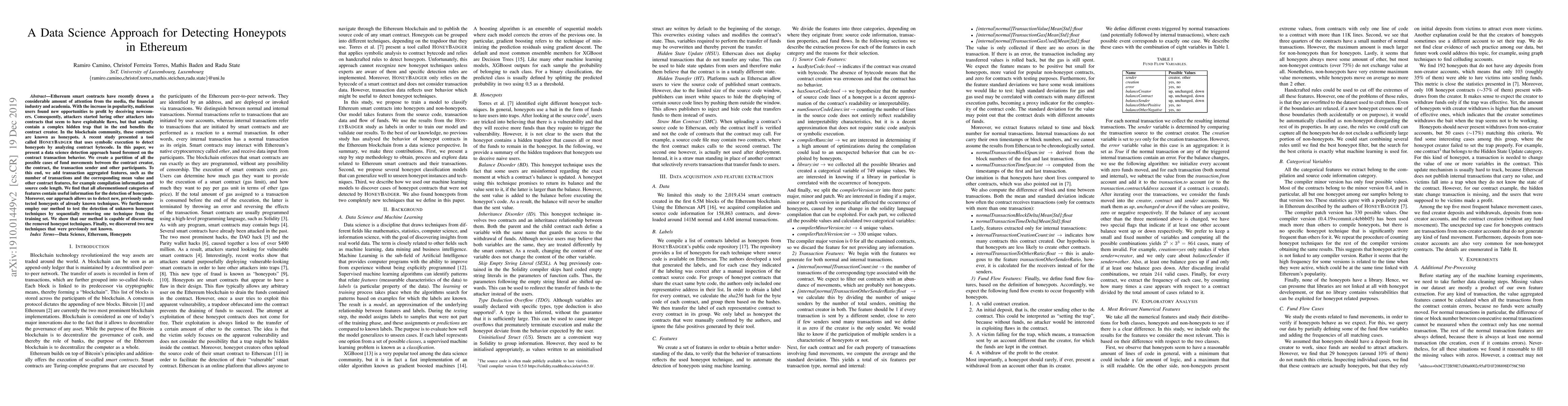 Researchers develop a data science approach to detect honeypot contracts in Ethereum using transaction behavior and aggregated features. Their method discovers new techniques and detects previously undetected honeypots, improving security against malicious users.
