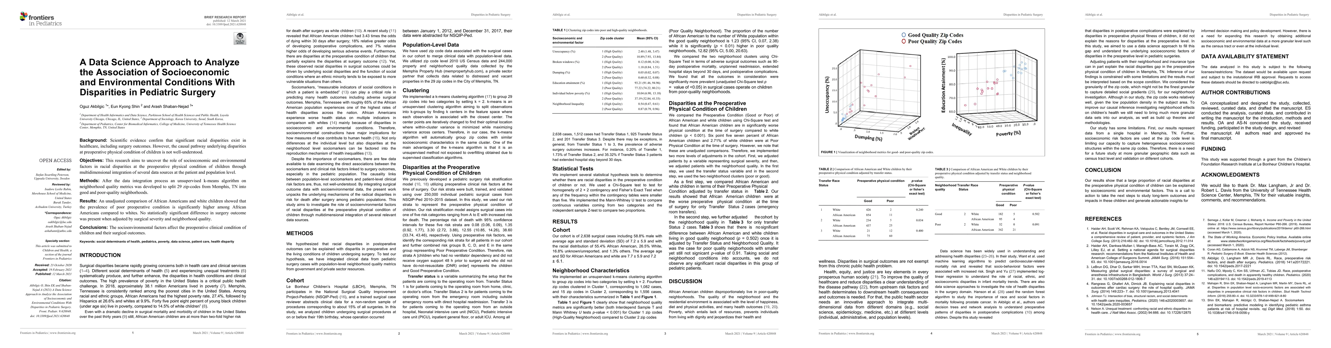 Scientific evidence confirm that significant racial disparities exist in healthcare, including surgery outcomes. However, the causal pathway underlying disparities at preoperative physical condition of children is not well-understood. This research aims to uncover the role of socioeconomic and environmental factors in racial disparities at the preoperative physical condition of children through multidimensional integration of several data sources at the patient and population level. After the data integration process an unsupervised k-means algorithm on neighborhood quality metrics was developed to split 29 zip-codes from Memphis, TN into good and poor-quality neighborhoods. An unadjusted comparison of African Americans and white children showed that the prevalence of poor preoperative condition is significantly higher among African Americans compared to whites. No statistically significant difference in surgery outcome was present when adjusted by surgical severity and neighborhood quality. The socioenvironmental factors affect the preoperative clinical condition of children and their surgical outcomes.