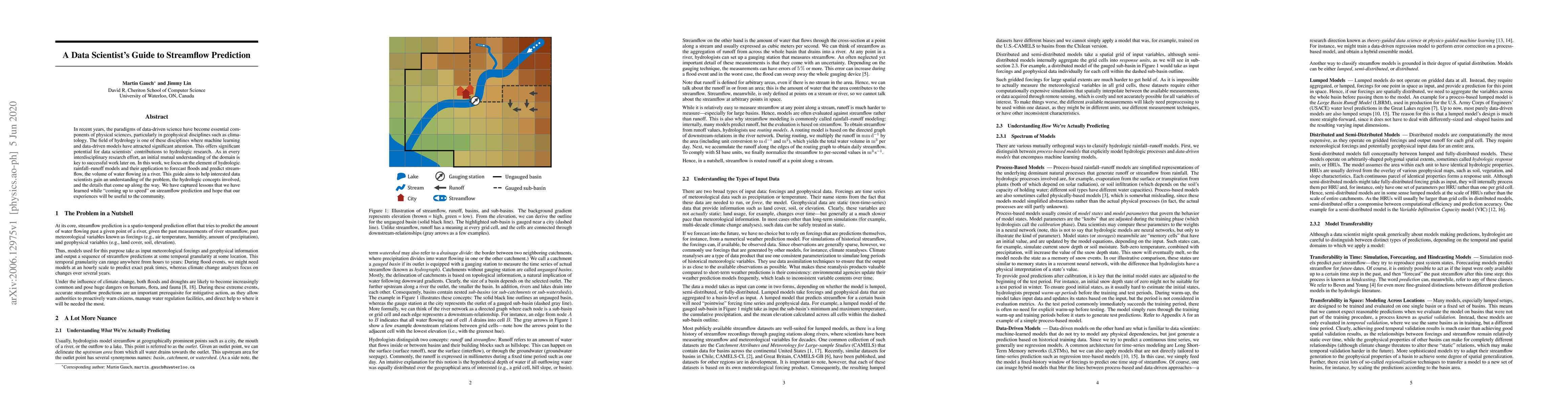 This guide helps data scientists understand hydrologic rainfall-runoff models and their application to forecast floods and predict streamflow in rivers. It aims to share lessons learned from the authors' experience with streamflow prediction to aid the community.