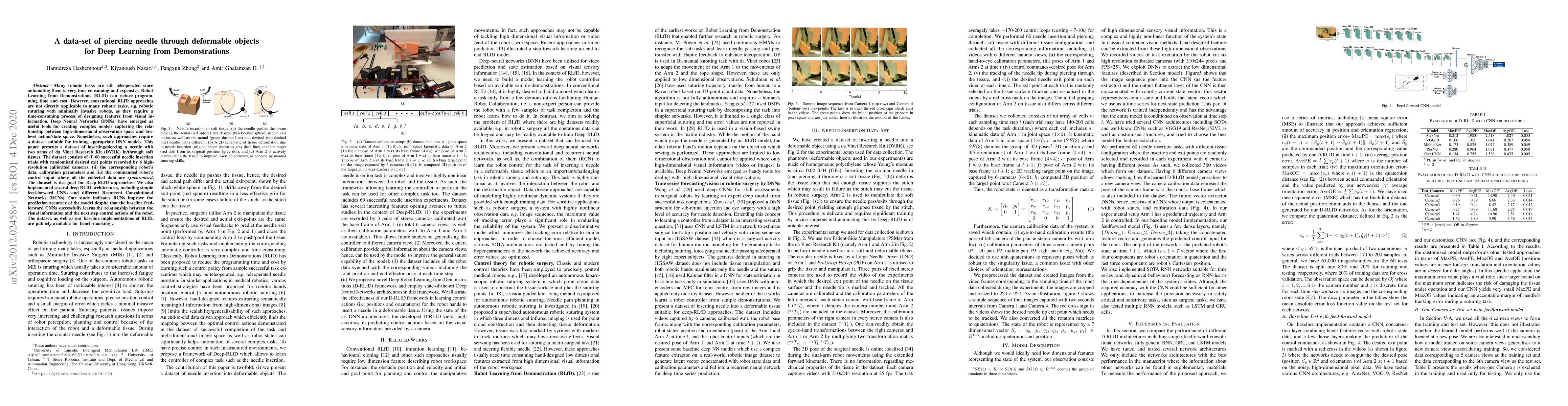 This paper presents a dataset for training Deep Learning from Demonstrations (RLfD) models, featuring 60 trials of needle insertion through soft tissues recorded by high-resolution cameras. The dataset includes synchronized visual, robot, and control data, and is designed to improve the automation of robotic tasks like suturing. The study shows that Recurrent Convolutional Networks (RCNs) outperform simple feed-forward CNNs in predicting control actions.