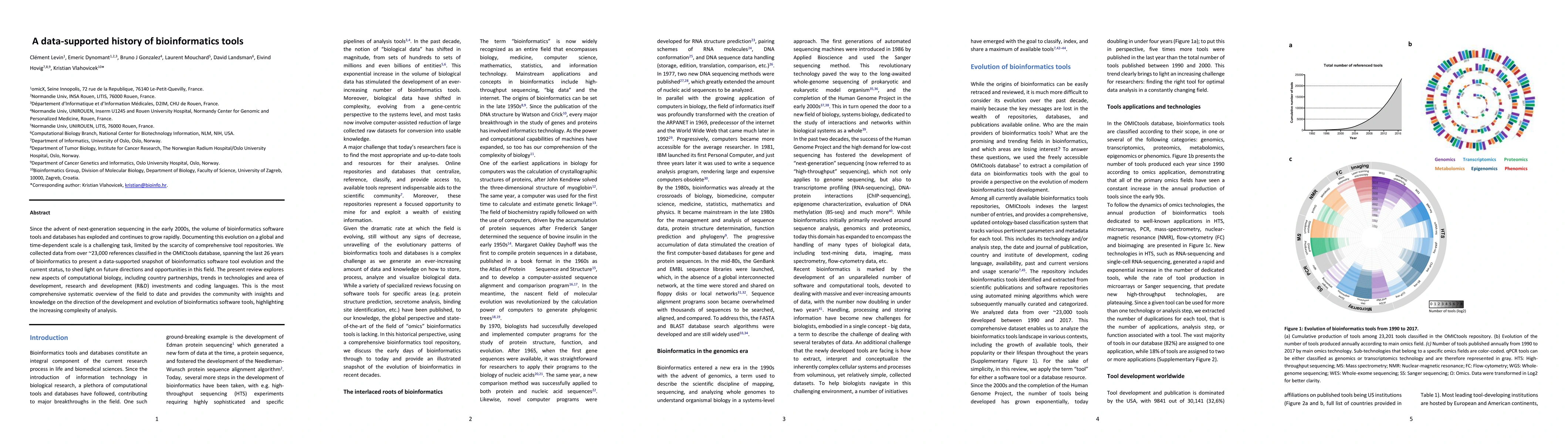 Since the advent of next-generation sequencing in the early 2000s, the volume of bioinformatics software tools and databases has exploded and continues to grow rapidly. Documenting this evolution on a global and time-dependent scale is a challenging task, limited by the scarcity of comprehensive tool repositories. We collected data from over ~23,000 references classified in the OMICtools database, spanning the last 26 years of bioinformatics to present a data-supported snapshot of bioinformatics software tool evolution and the current status, to shed light on future directions and opportunities in this field. The present review explores new aspects of computational biology, including country partnerships, trends in technologies and area of development, research and development (R&D) investments and coding languages. This is the most comprehensive systematic overview of the field to date and provides the community with insights and knowledge on the direction of the development and evolution of bioinformatics software tools, highlighting the increasing complexity of analysis.
