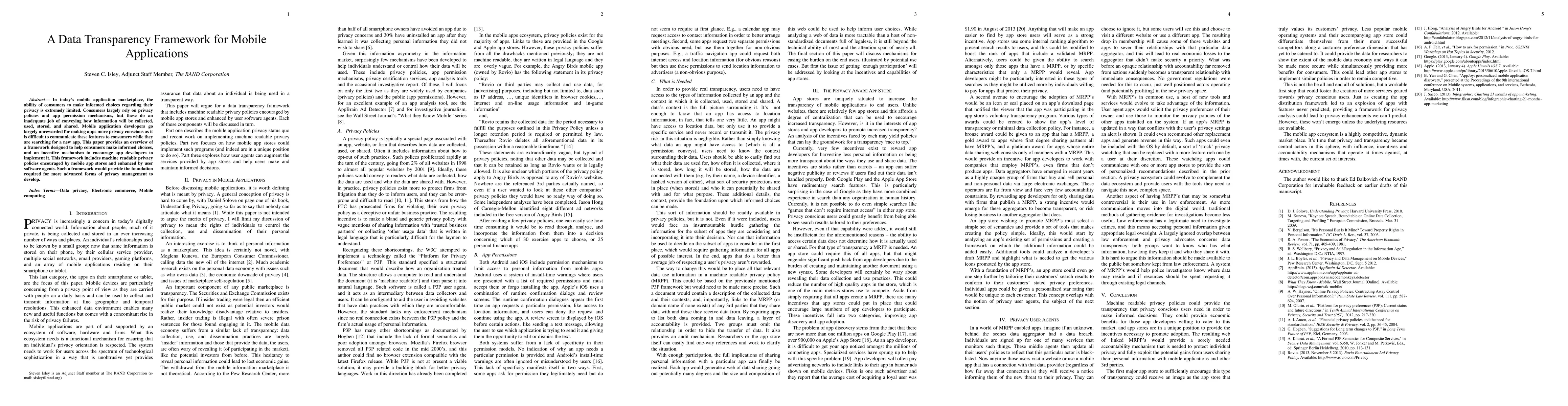 This paper proposes a data transparency framework to empower consumers to make informed privacy choices for mobile applications, and introduces an incentive mechanism to encourage developers to adopt it. The framework utilizes machine-readable privacy policies and user software agents to better communicate app data practices.