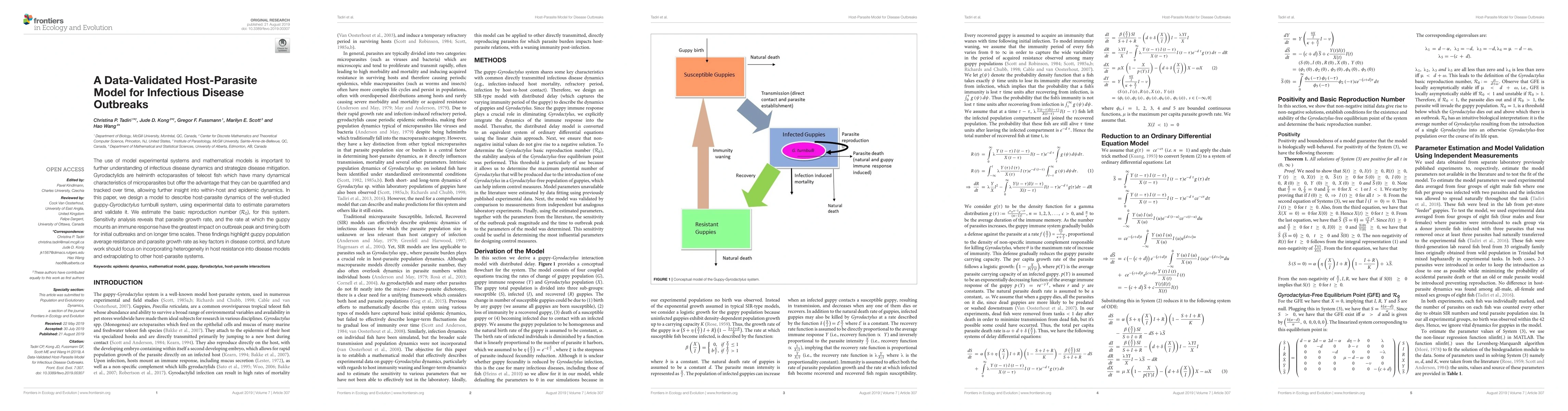 This paper develops a validated host-parasite model for the guppy-Gyrodactylus turnbulli system, revealing that parasite growth rate and immune response are crucial for outbreak dynamics. The study emphasizes the importance of guppy resistance and parasite virulence in disease control.