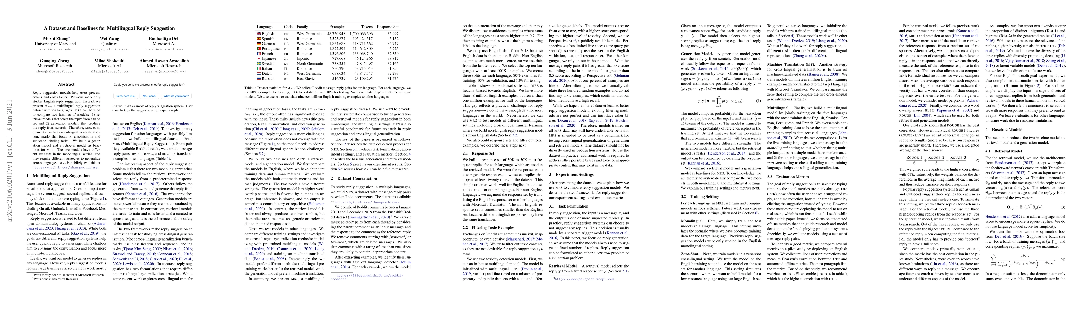 This paper introduces MRS, a multilingual dataset for reply suggestion in ten languages, offering benchmarks for both retrieval and generation models. It presents two baselines to demonstrate the dataset's utility and highlights the different strategies needed for cross-lingual generalization.