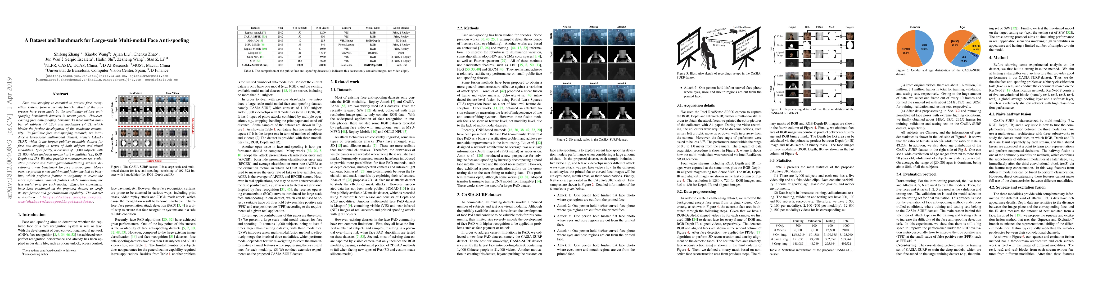 This paper presents the CASIA-SURF dataset, a large-scale multi-modal face anti-spoofing benchmark with 1,000 subjects and 3 visual modalities (RGB, Depth, and IR). It aims to advance research by providing a comprehensive dataset and evaluation protocol, along with a new multi-modal fusion method for baseline performance.