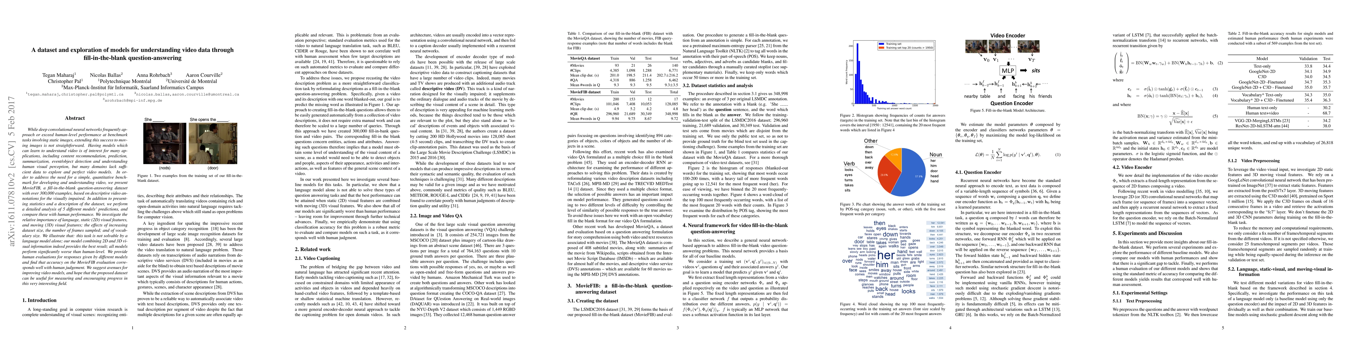 The paper presents MovieFIB, a large fill-in-the-blank question-answering dataset for video understanding, and explores the performance of various models against human benchmarks. The study finds that combining 2D and 3D visual features yields the best results, but all models still lag behind human performance, highlighting the need for further advancements in video comprehension models.