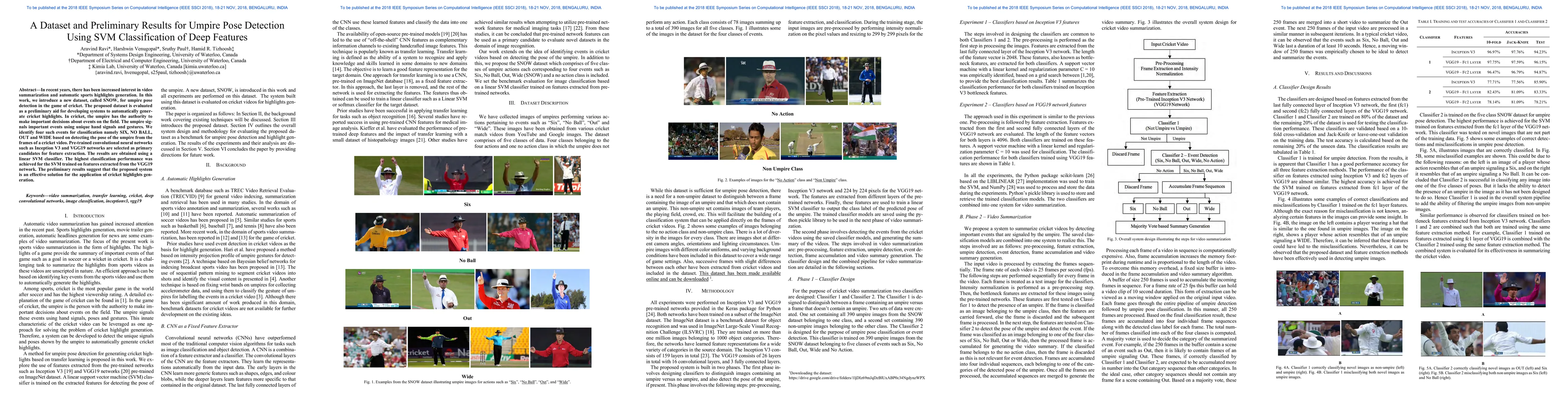 Researchers introduce a new dataset called SNOW for umpire pose detection in cricket, achieving highest classification performance using SVM on VGG19 network features.