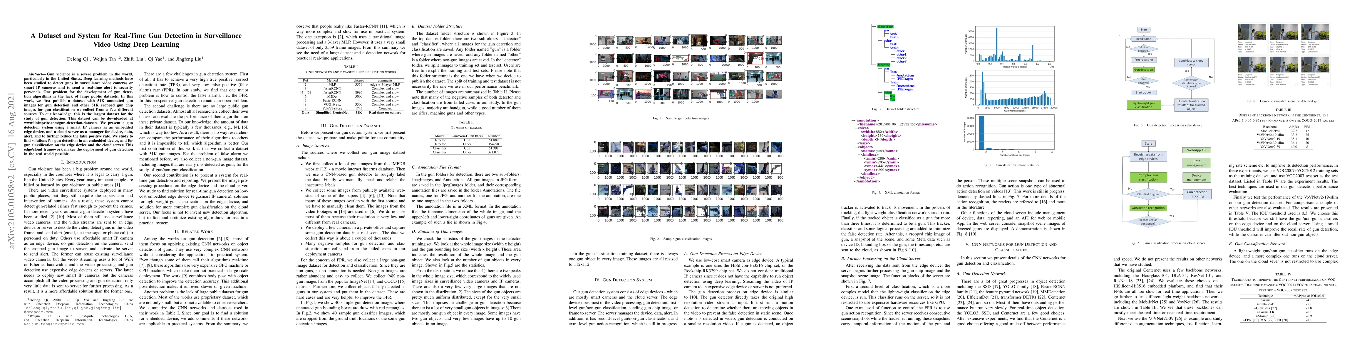 This paper presents a large dataset of 102K annotated gun images for detection and classification, aiming to advance gun detection research. It also introduces a real-time gun detection system using a smart IP camera and a cloud server to reduce false positives and enable practical deployment.