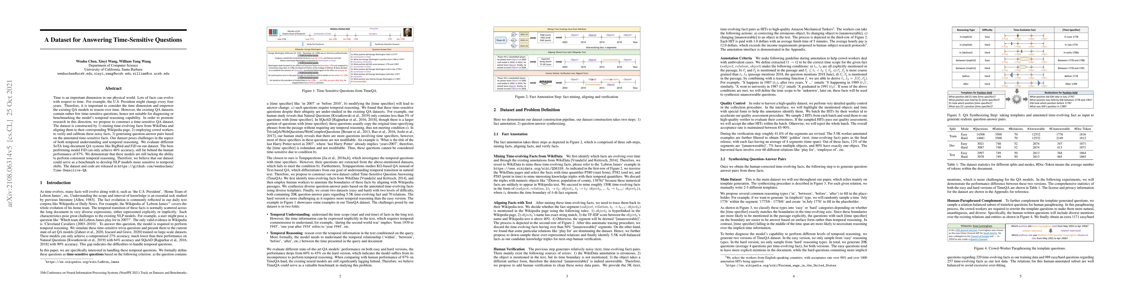 Time is an important dimension in our physical world. Lots of facts can evolve with respect to time. For example, the U.S. President might change every four years. Therefore, it is important to consider the time dimension and empower the existing QA models to reason over time. However, the existing QA datasets contain rather few time-sensitive questions, hence not suitable for diagnosing or benchmarking the model's temporal reasoning capability. In order to promote research in this direction, we propose to construct a time-sensitive QA dataset. The dataset is constructed by 1) mining time-evolving facts from WikiData and aligning them to their corresponding Wikipedia page, 2) employing crowd workers to verify and calibrate these noisy facts, 3) generating question-answer pairs based on the annotated time-sensitive facts. Our dataset poses challenges in the aspect of both temporal understanding and temporal reasoning. We evaluate different SoTA long-document QA systems like BigBird and FiD on our dataset. The best-performing model FiD can only achieve 46\% accuracy, still far behind the human performance of 87\%. We demonstrate that these models are still lacking the ability to perform consistent temporal reasoning. Therefore, we believe that our dataset could serve as a benchmark to develop NLP models more sensitive to temporal shifts. The dataset and code are released in~\url{https://github.com/wenhuchen/Time-Sensitive-QA}.