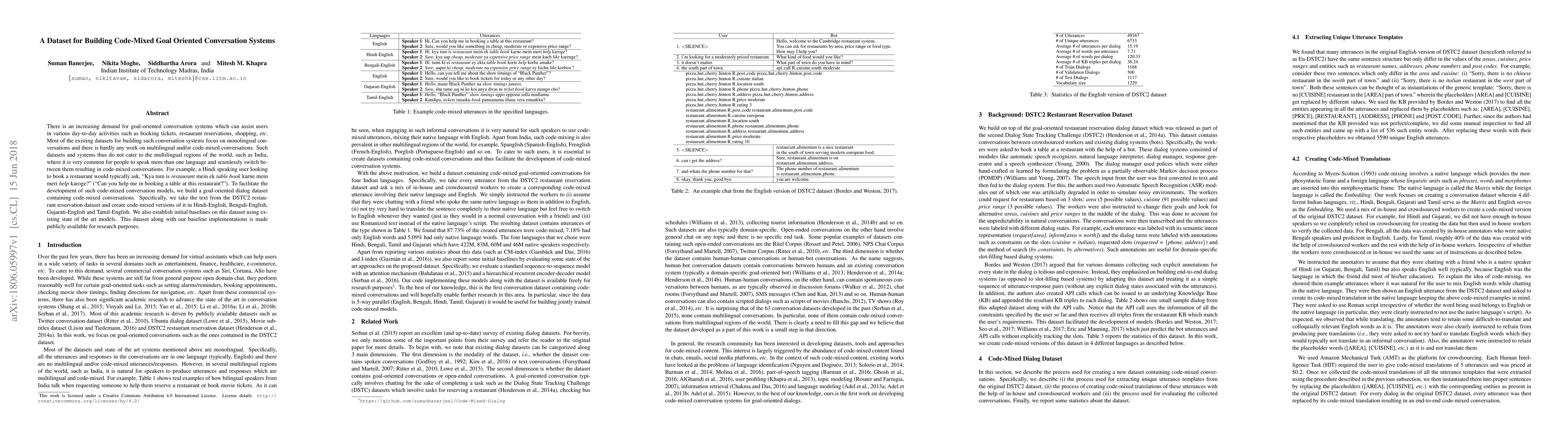 There is an increasing demand for goal-oriented conversation systems which can assist users in various day-to-day activities such as booking tickets, restaurant reservations, shopping, etc. Most of the existing datasets for building such conversation systems focus on monolingual conversations and there is hardly any work on multilingual and/or code-mixed conversations. Such datasets and systems thus do not cater to the multilingual regions of the world, such as India, where it is very common for people to speak more than one language and seamlessly switch between them resulting in code-mixed conversations. For example, a Hindi speaking user looking to book a restaurant would typically ask, "Kya tum is restaurant mein ek table book karne mein meri help karoge?" ("Can you help me in booking a table at this restaurant?"). To facilitate the development of such code-mixed conversation models, we build a goal-oriented dialog dataset containing code-mixed conversations. Specifically, we take the text from the DSTC2 restaurant reservation dataset and create code-mixed versions of it in Hindi-English, Bengali-English, Gujarati-English and Tamil-English. We also establish initial baselines on this dataset using existing state of the art models. This dataset along with our baseline implementations is made publicly available for research purposes.