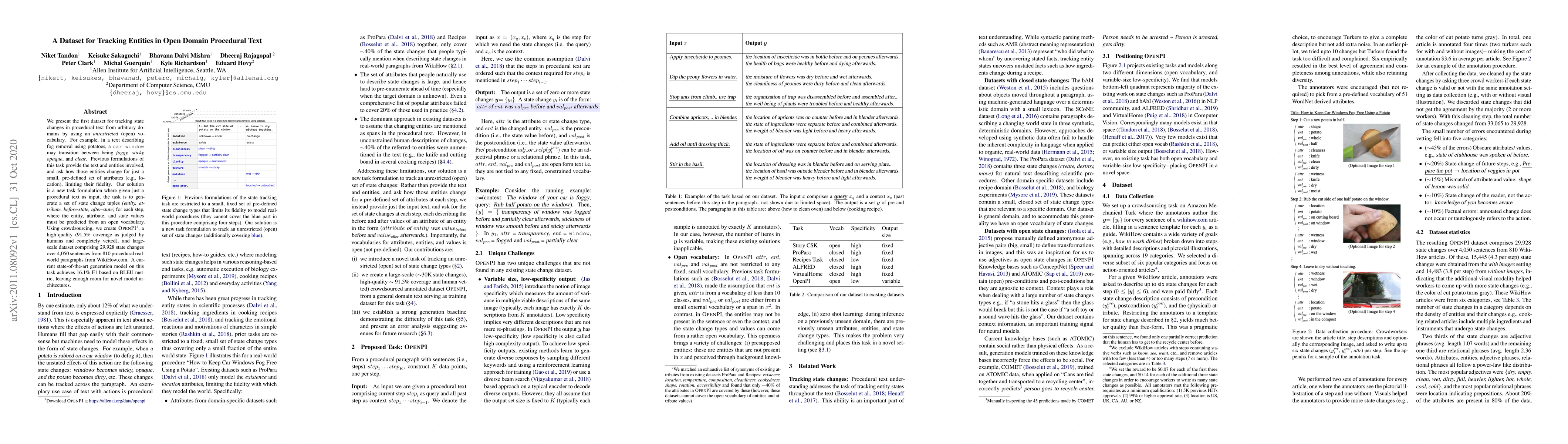 We present the first dataset for tracking state changes in procedural text from arbitrary domains by using an unrestricted (open) vocabulary. For example, in a text describing fog removal using potatoes, a car window may transition between being foggy, sticky,opaque, and clear. Previous formulations of this task provide the text and entities involved,and ask how those entities change for just a small, pre-defined set of attributes (e.g., location), limiting their fidelity. Our solution is a new task formulation where given just a procedural text as input, the task is to generate a set of state change tuples(entity, at-tribute, before-state, after-state)for each step,where the entity, attribute, and state values must be predicted from an open vocabulary. Using crowdsourcing, we create OPENPI1, a high-quality (91.5% coverage as judged by humans and completely vetted), and large-scale dataset comprising 29,928 state changes over 4,050 sentences from 810 procedural real-world paragraphs from WikiHow.com. A current state-of-the-art generation model on this task achieves 16.1% F1 based on BLEU metric, leaving enough room for novel model architectures.